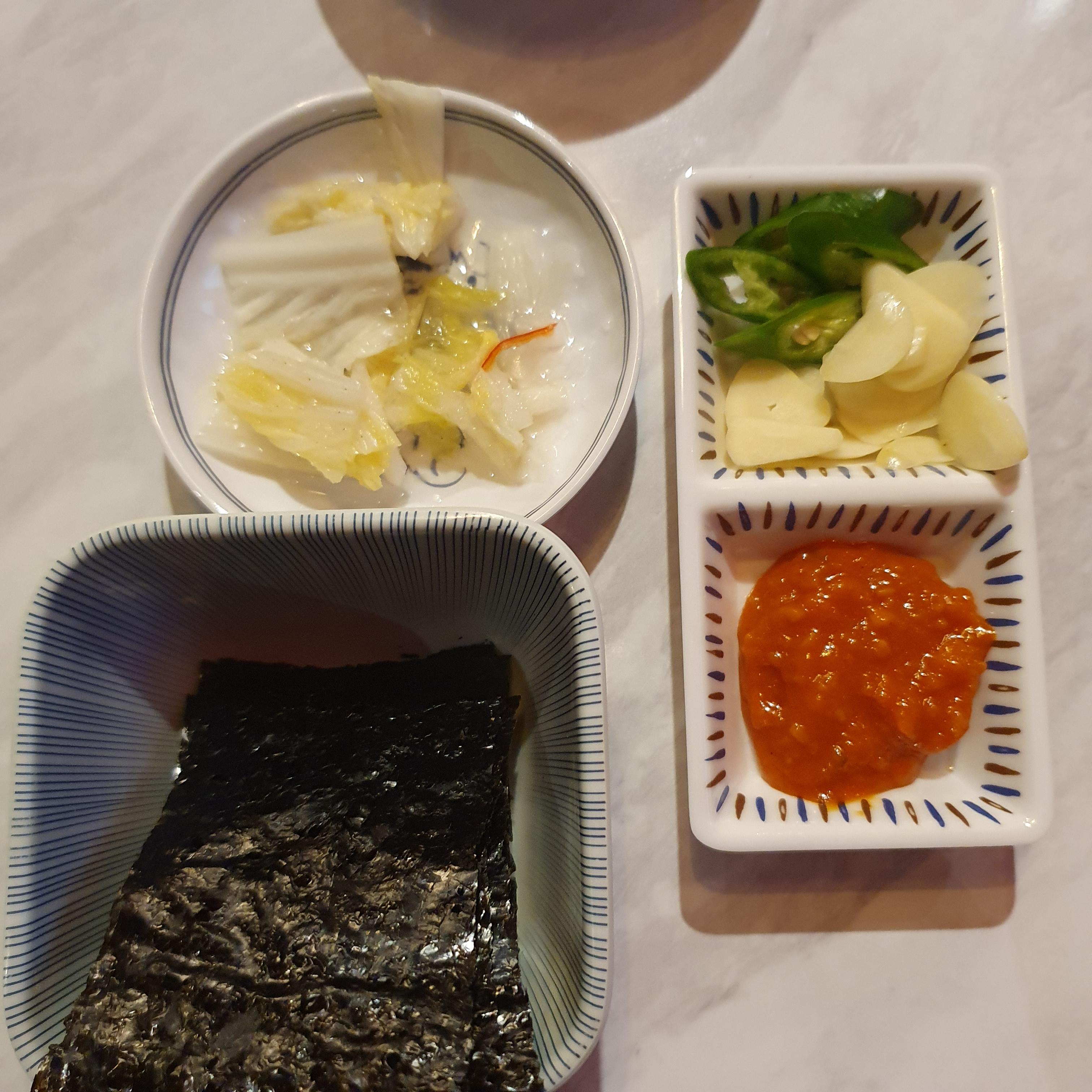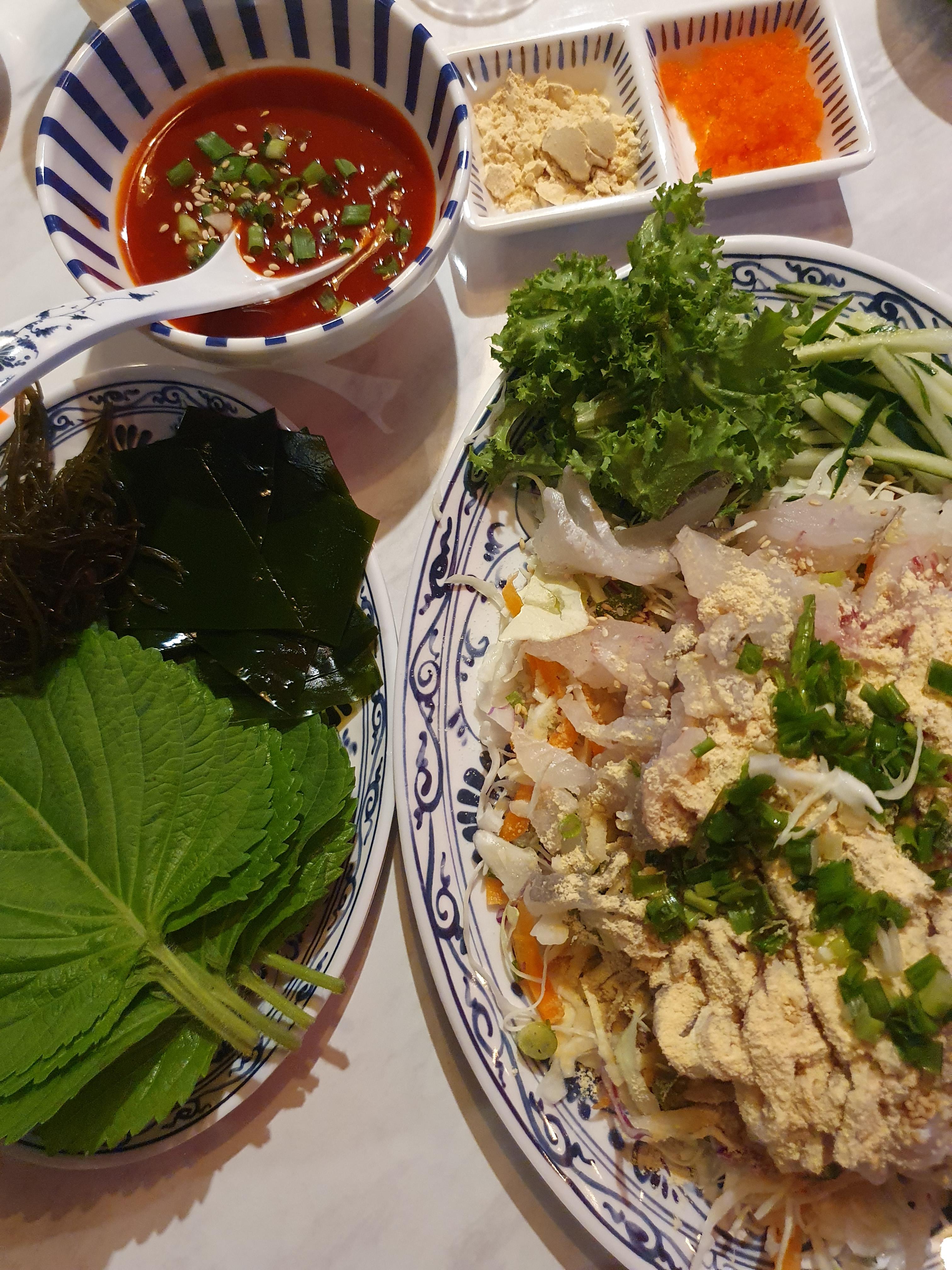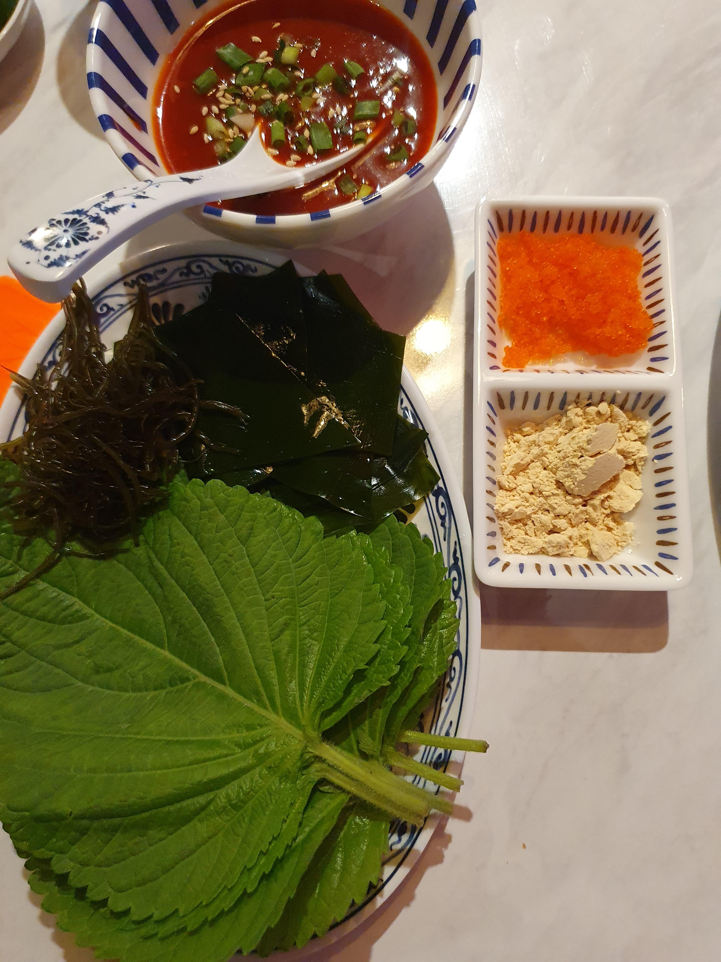 이렇게 채소와 해초류 등이 푸짐하게 나왔는데, 쌈을 안싸먹으면 예의가 아닌것 같은 느낌이 들 정도였습니다.