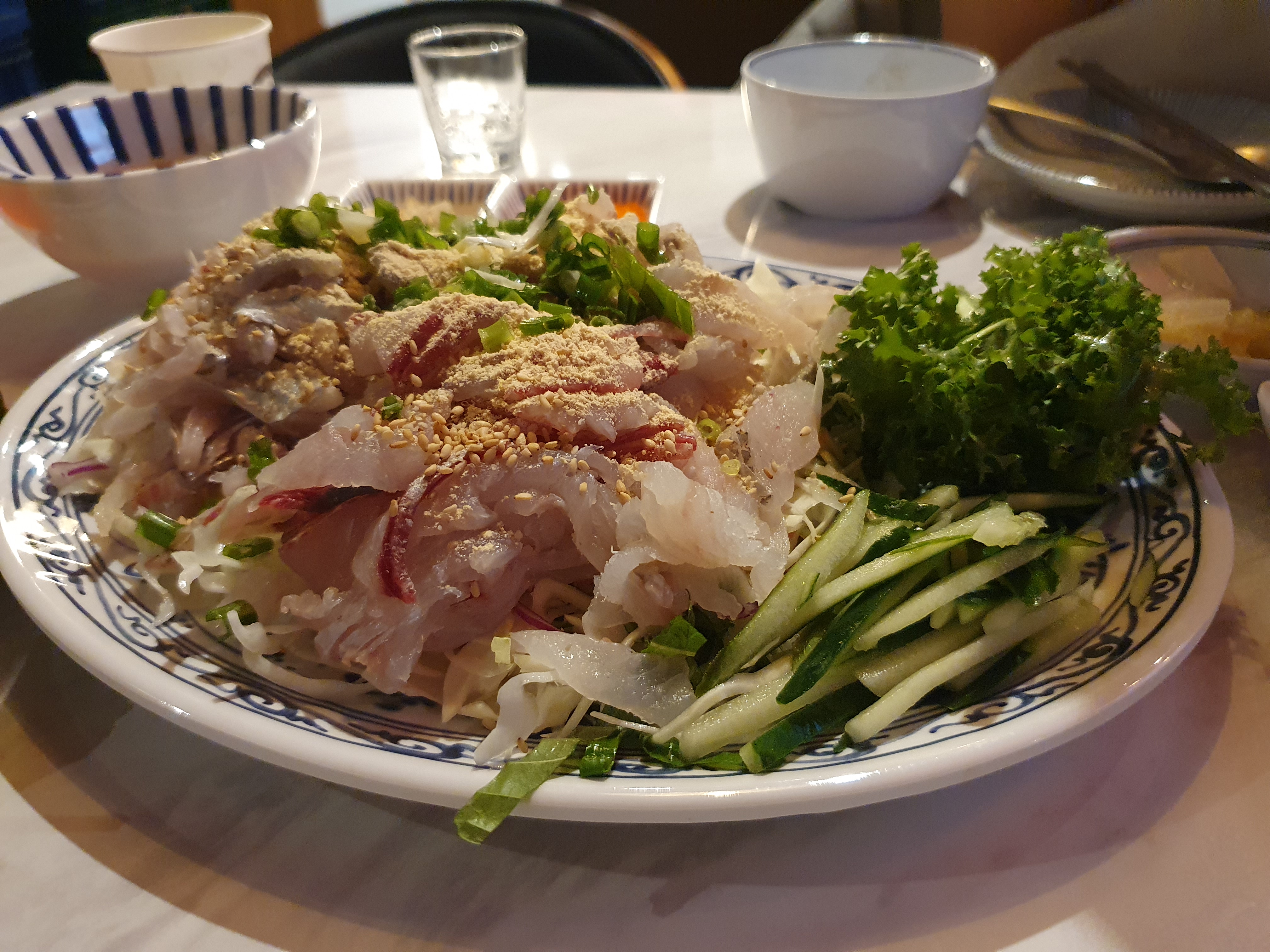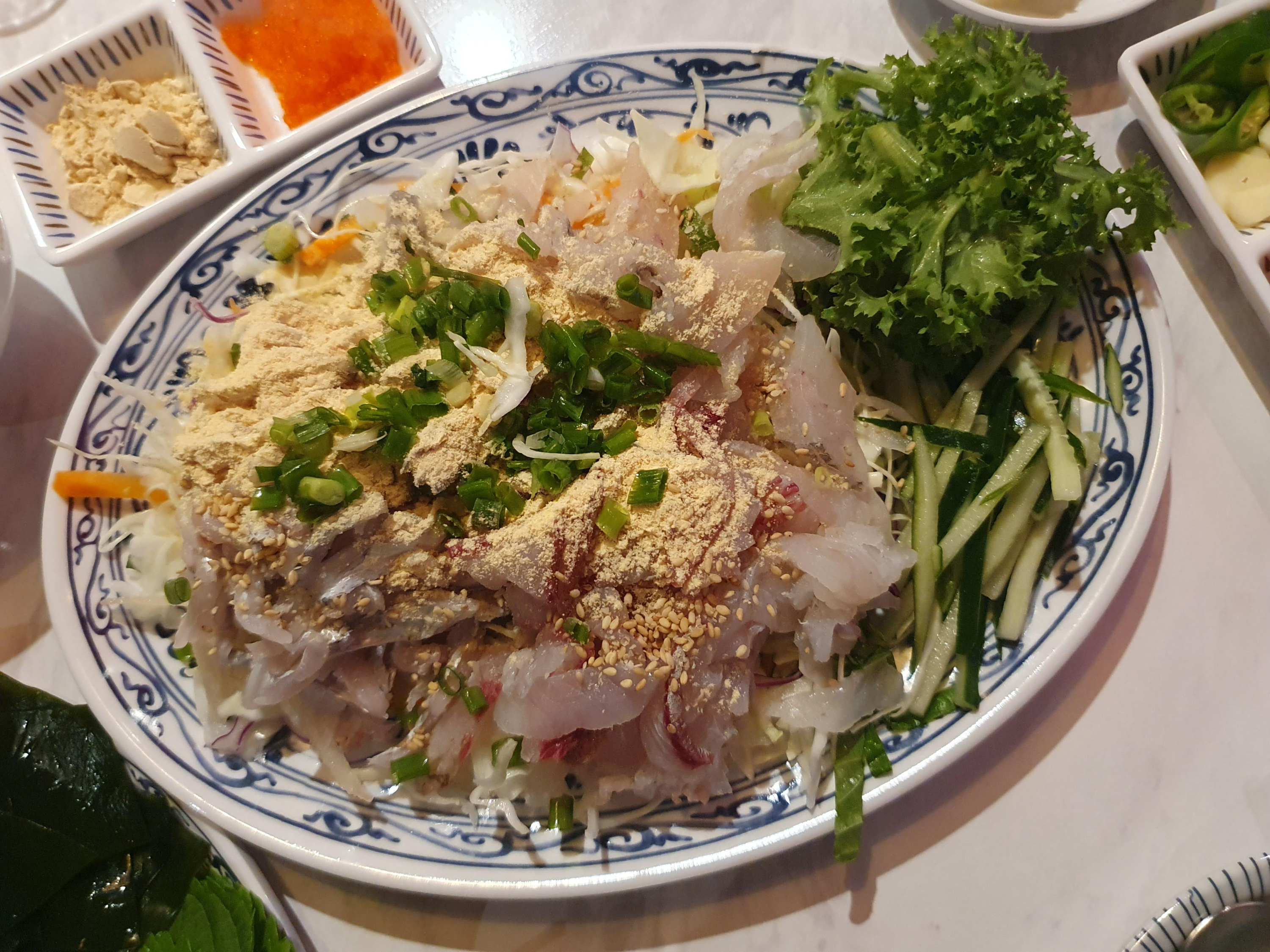 각종 채소와 콩가루가 뿌려져있는 막회 정말 먹음직스러웠는데요.