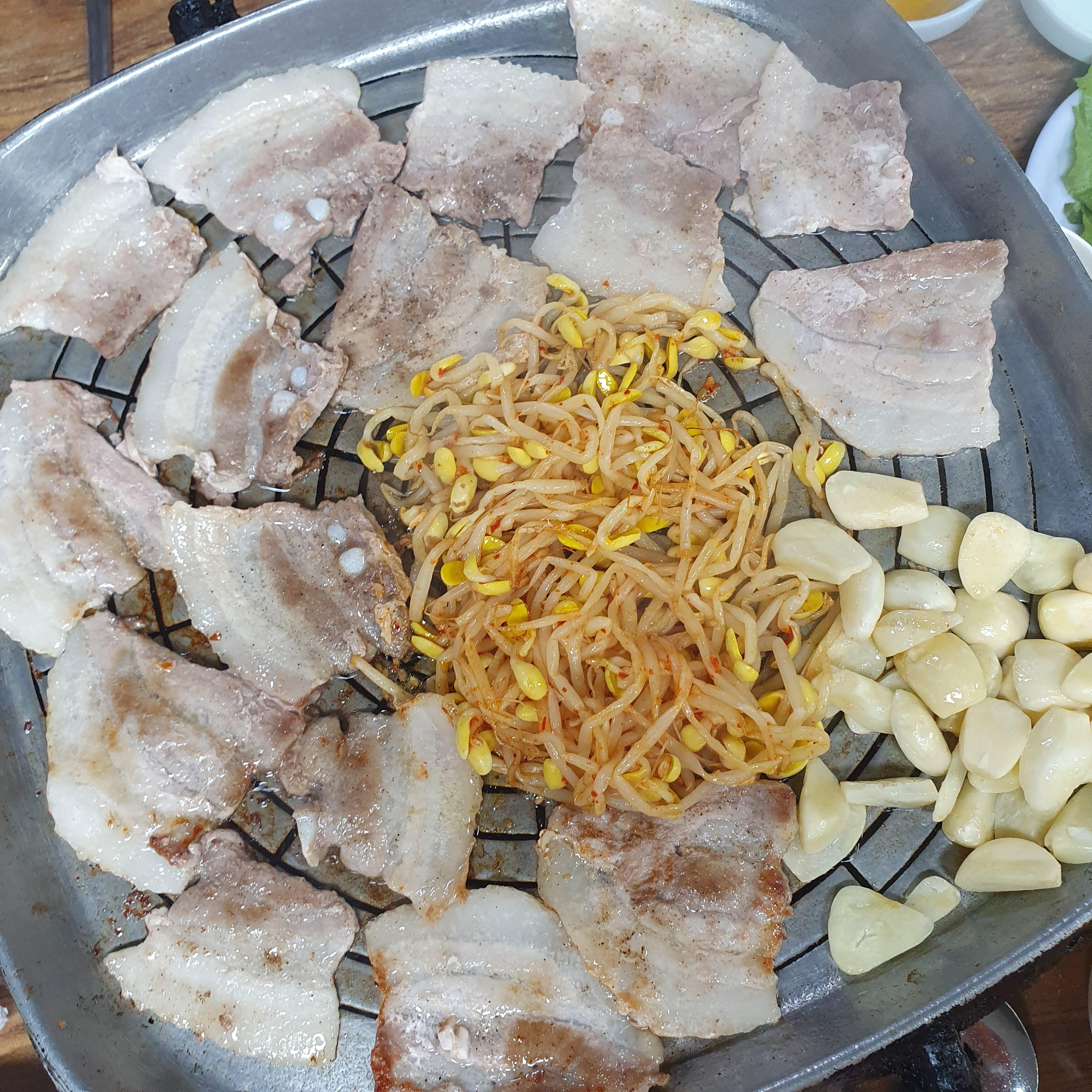 불판위에 삼겹살을 넣고 굽다가 마늘과 콩나물도 추가로 함께 구웠습니다.