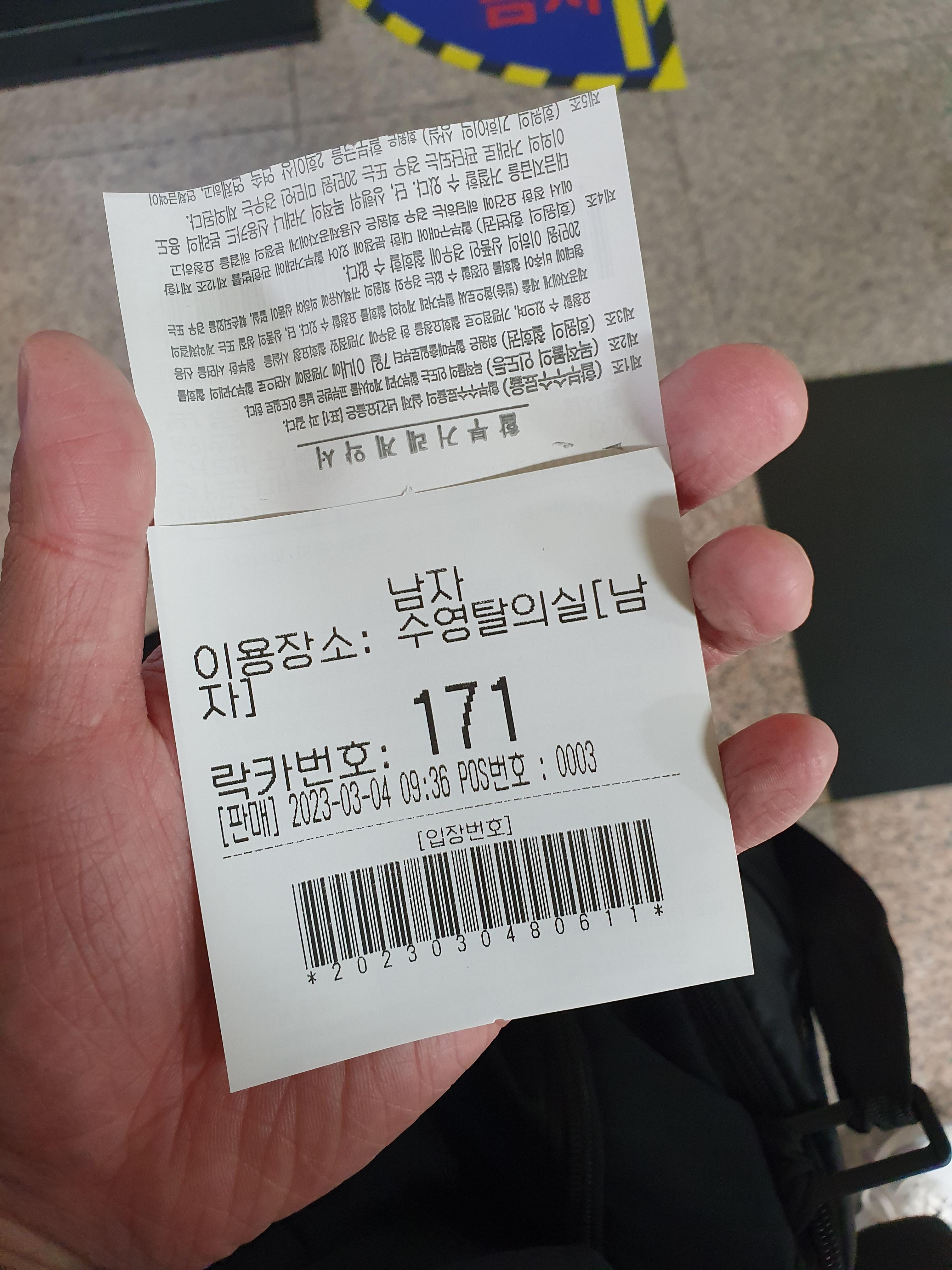 스쿼시 2시간을 발권하면, 이렇게 번호가 써있는 수영탈의실 이용권이 나옵니다.