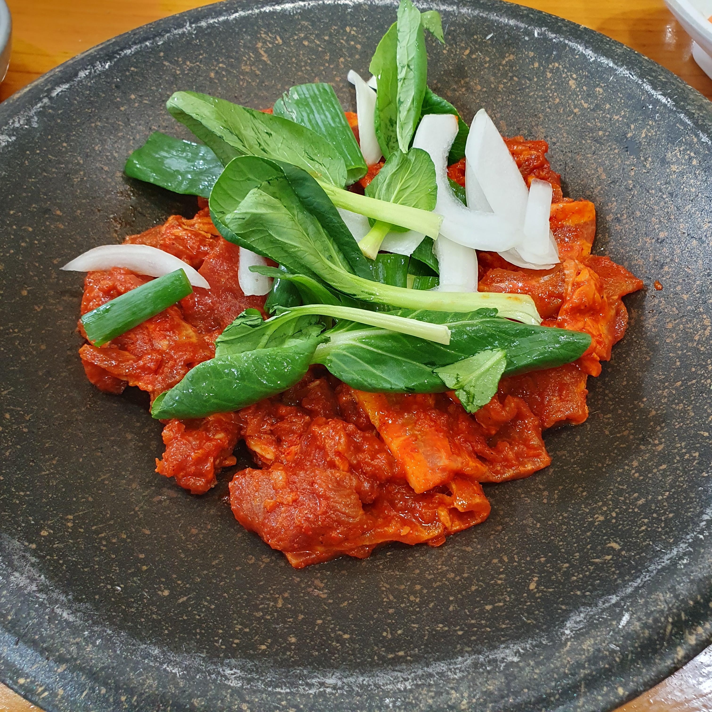 그리고선 바로 제육볶음이 나오는데, 이 곳은 익혀져 나오는 제육이 아닌, 자리에서 익혀먹는 제육볶음입니다.