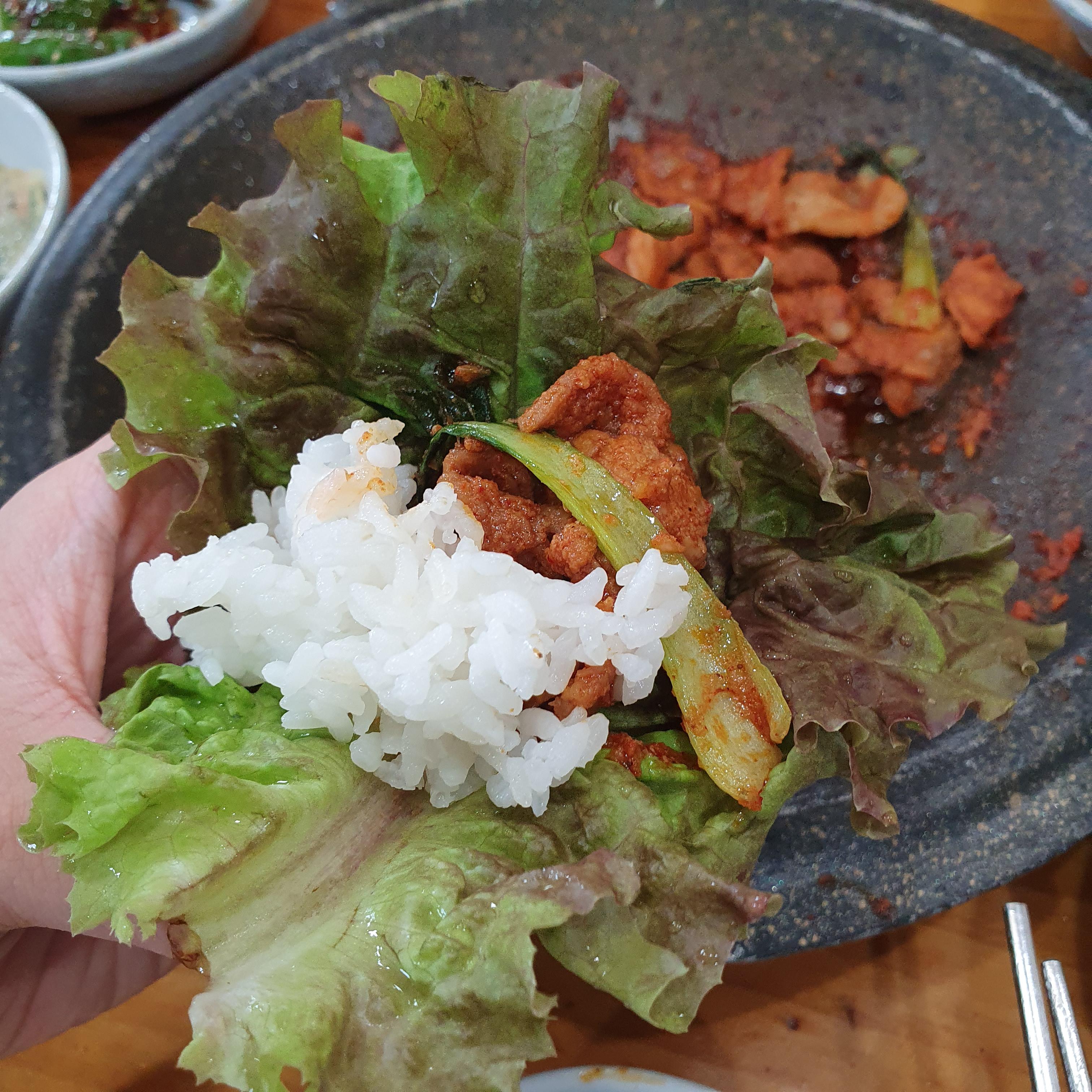 제육볶음을 쌈에 싸서 야무지게 먹고, 생선구이도 큼지막하게 발라먹고 정말 딱 한식이네 하는 식사였습니다.