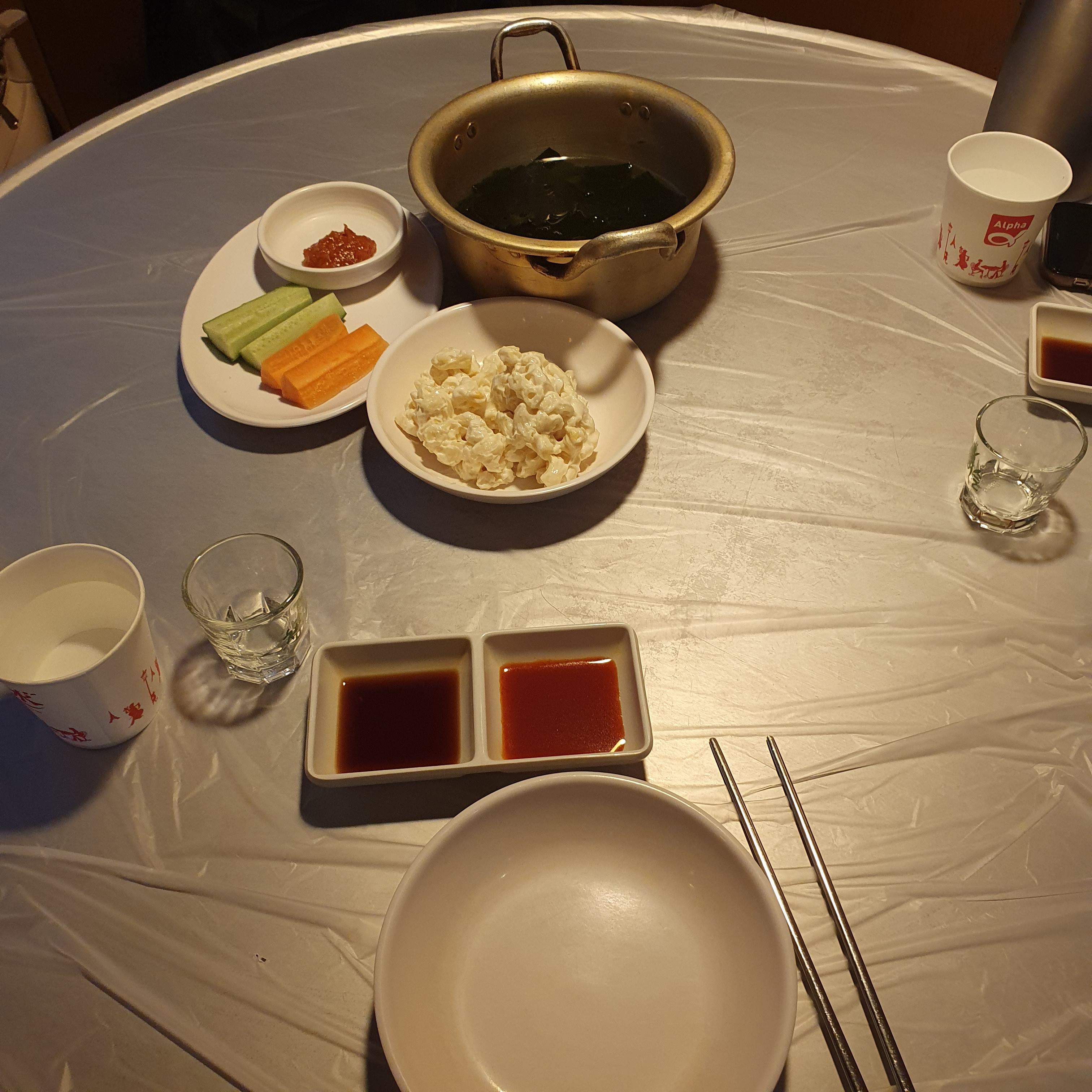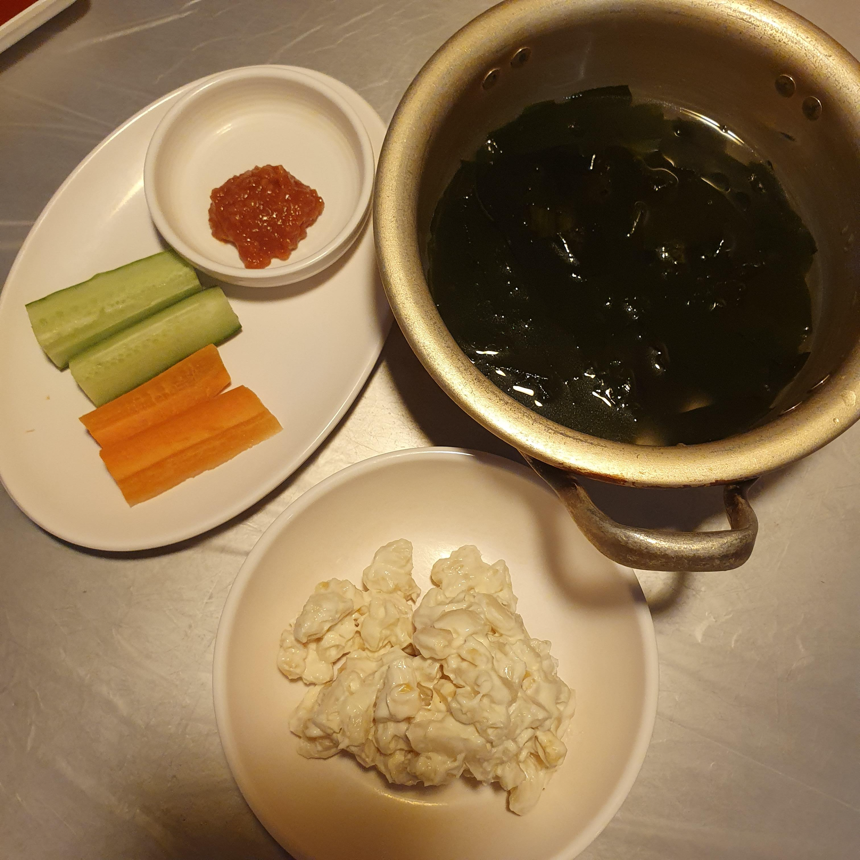 생오이, 생당근, 미역국, 마카로니 샐러드