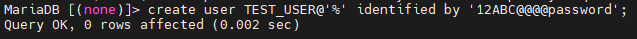 > create user TEST_USER@'%' identified by '12ABC@@@@password';