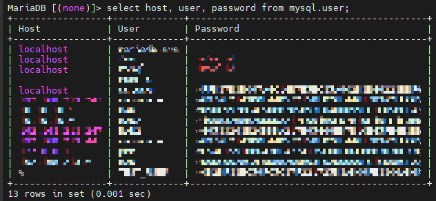 select host, user, password from mysql.user;