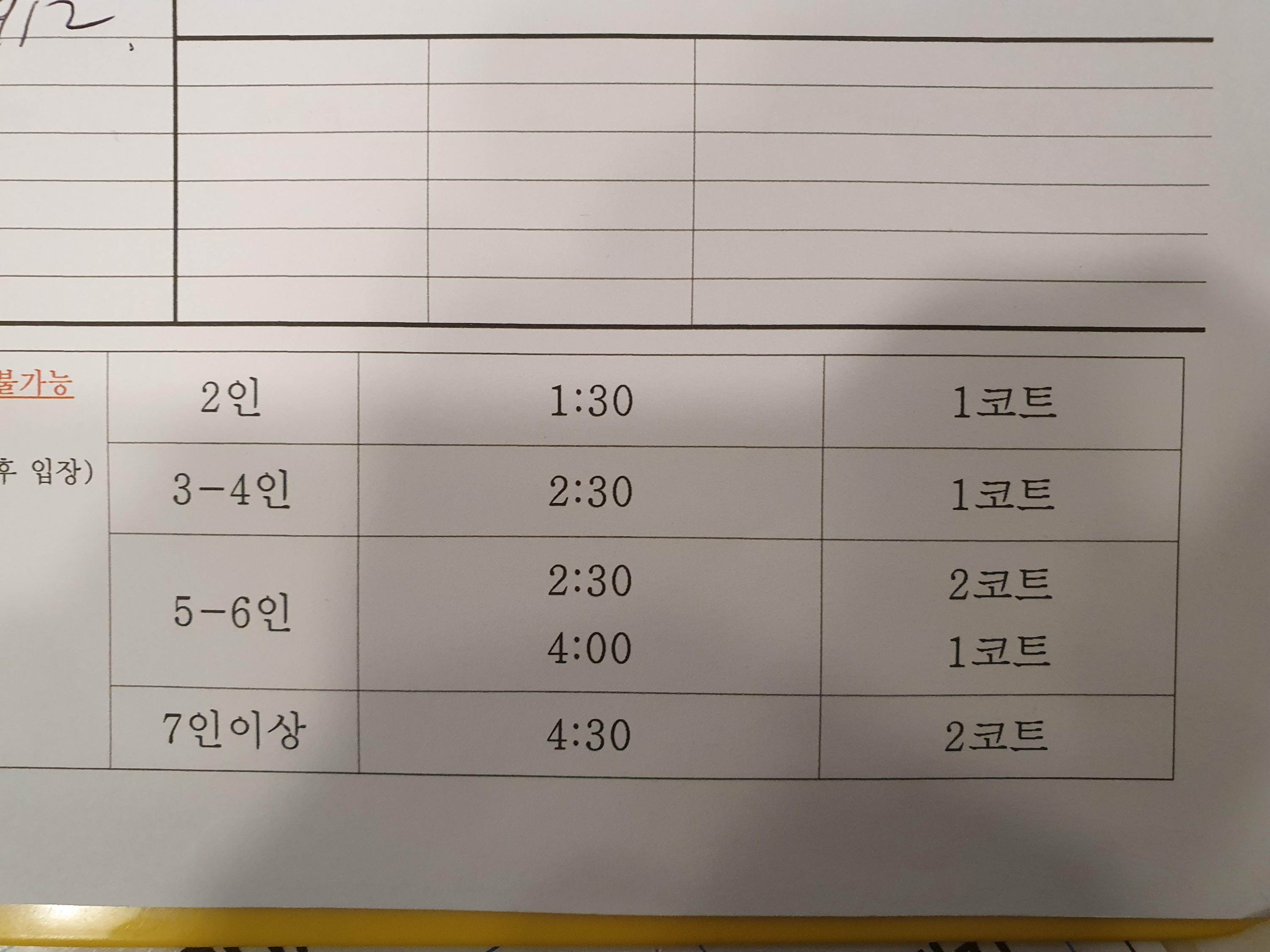 3~4인의 경우 1개의 코트를 2시간 30분, 5~6인일 경우 2개의 코트 혹은 1개의 코트를 각각 시간에 맞게 빌릴 수 있습니다.