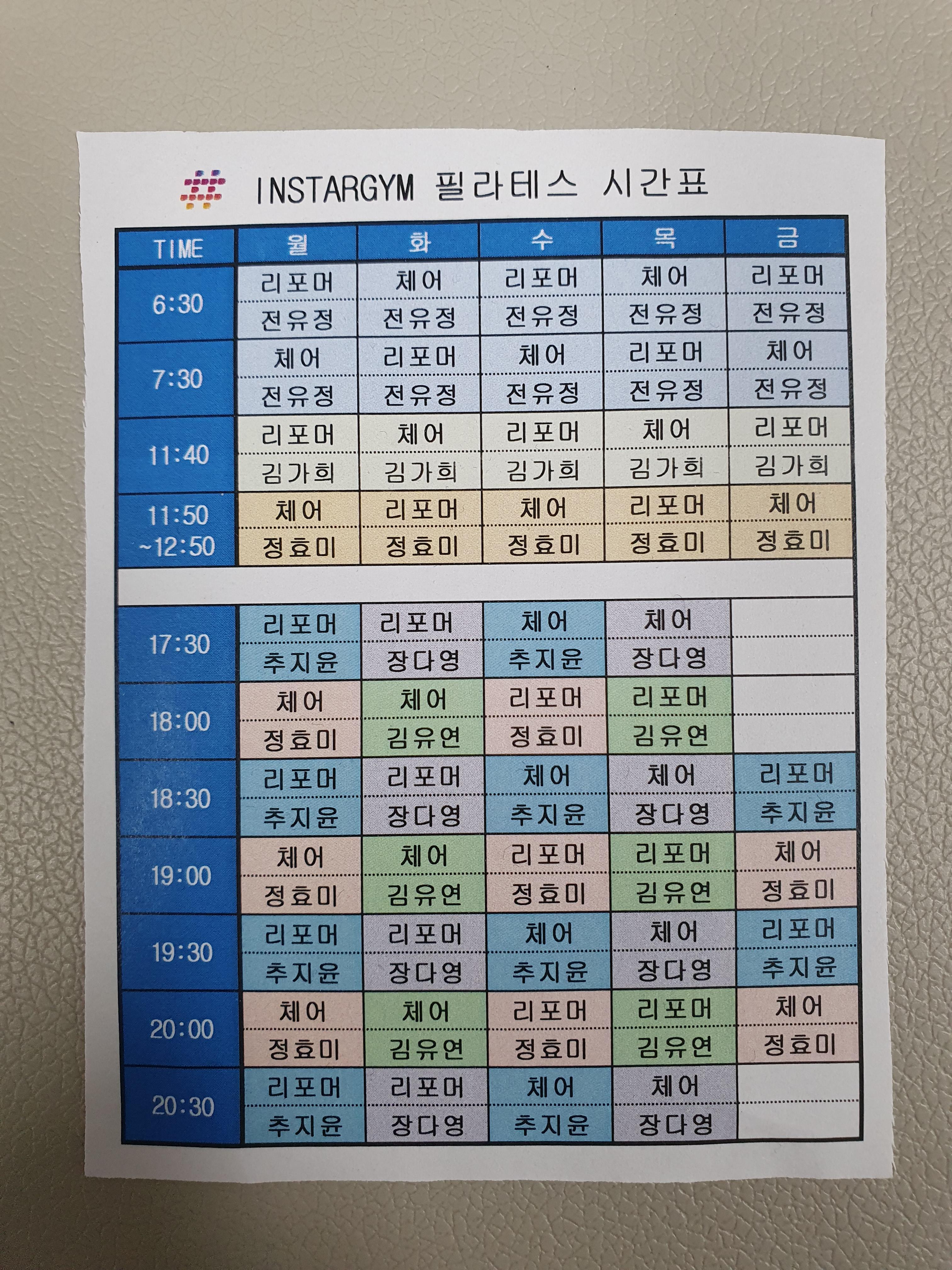 인스타짐 필라테스는 보통의 필라테스와 다르게 시간표에 맞게 선착순으로 방문하여 이름을 적어 해당 인원이 그 시간때의 수업을 듣는 방식인데요. 다른곳은 어플로 예약을 등록한다고 하더라구요.