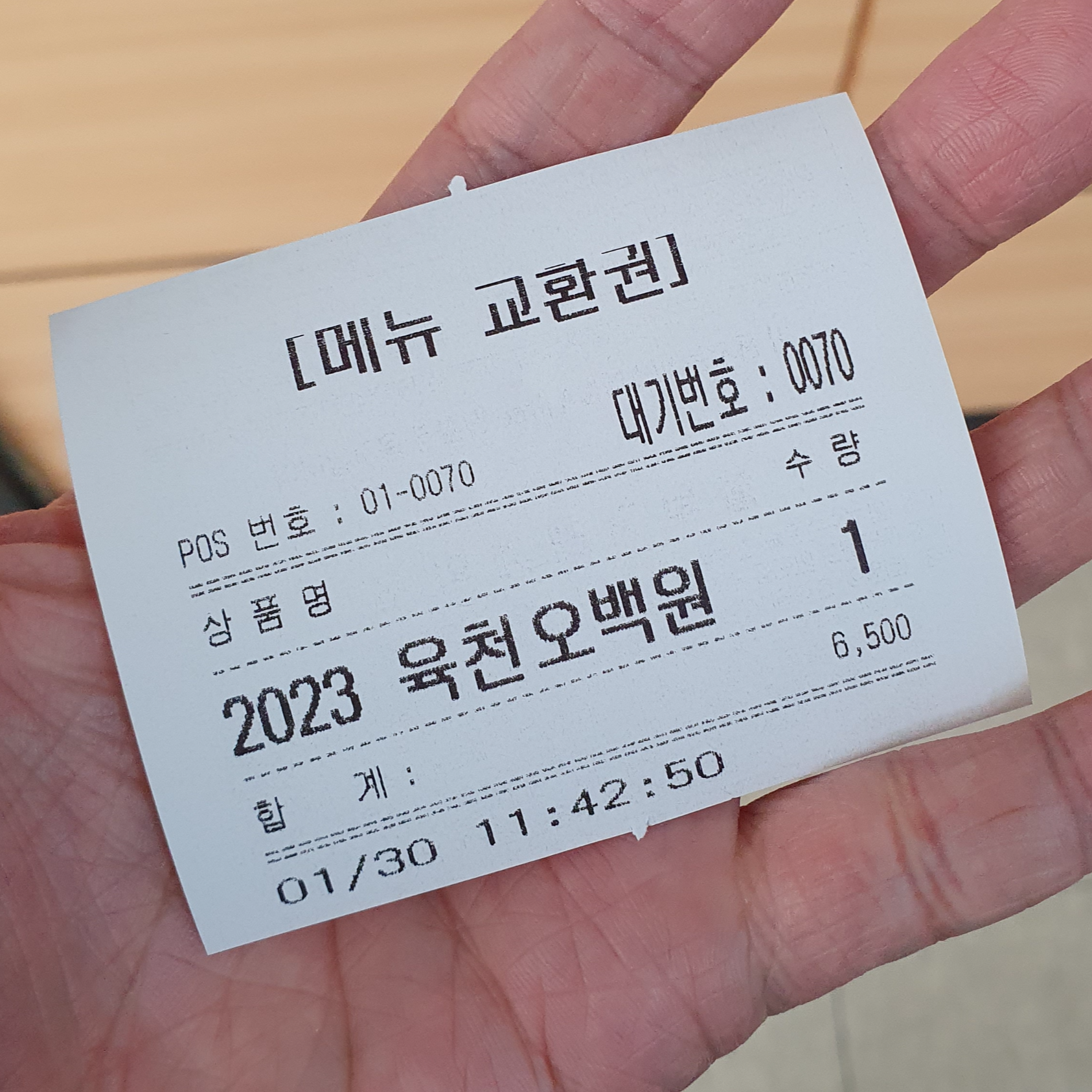 키오스크에서 뽑은 식권은 이렇게 영수증 형태인데요.