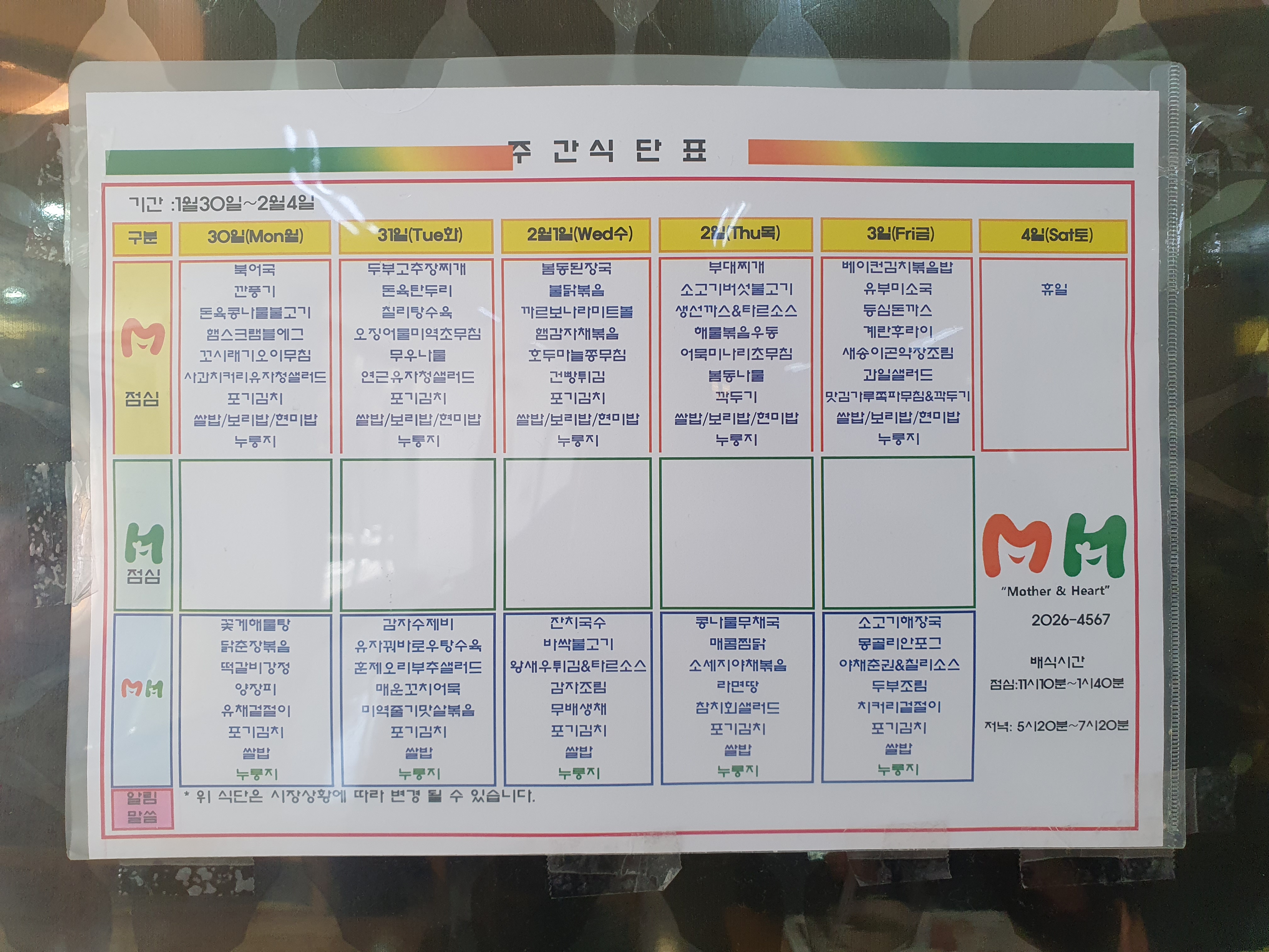 주간 식단표가 들어가는 입구 옆에 붙어있습니다.
