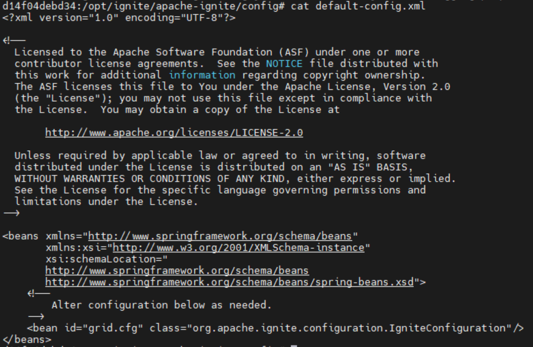<bean id="grid.cfg" class="org.apache.ignite.configuration.IgniteConfiguration"/>