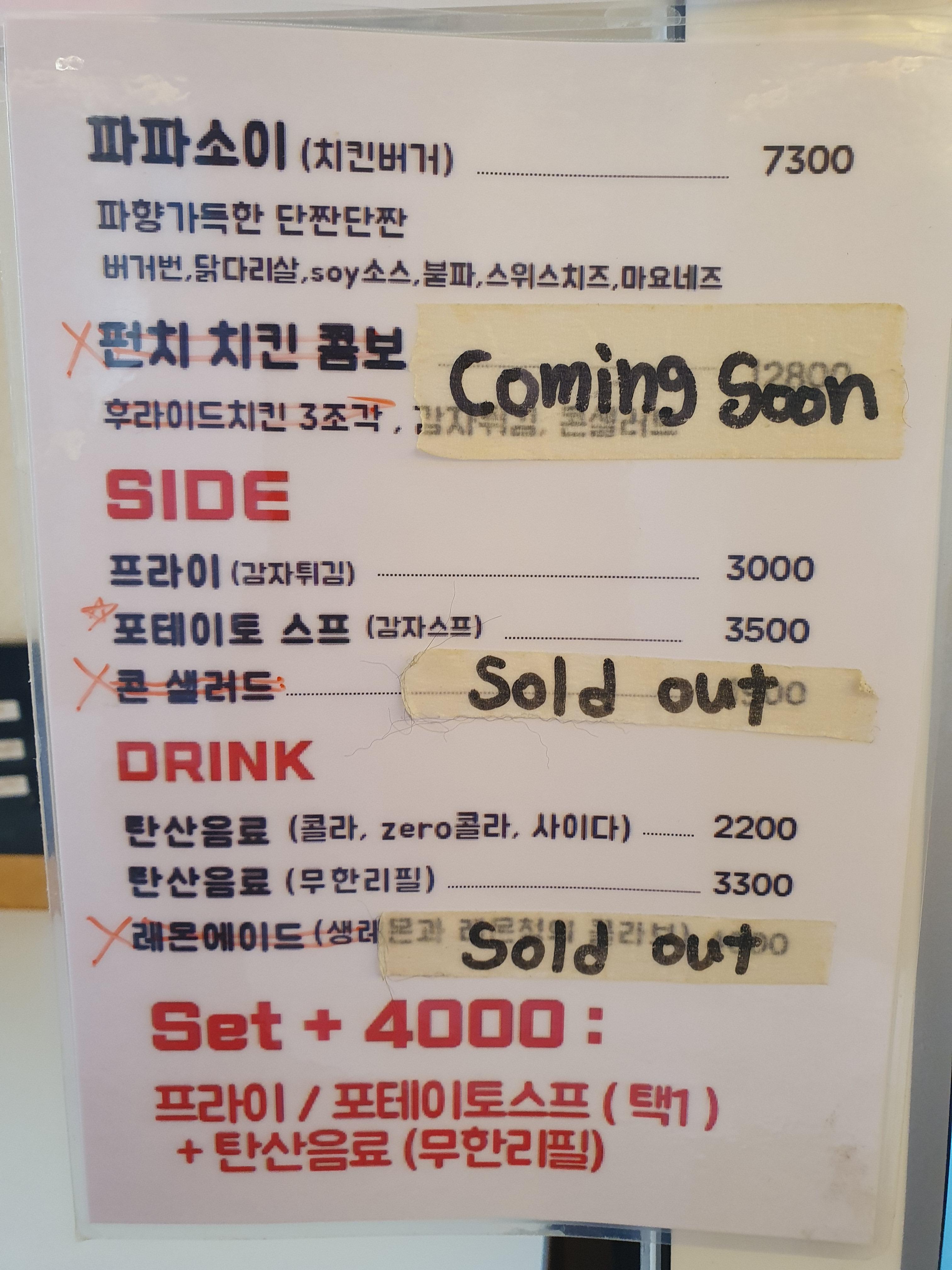 사이드메뉴가 3000원 이상이고 음료 무한리필이 3300원인데, 세트가 4천원이라뇨? 이건 그냥 무조건 세트로 먹으라는 뜻이군요.