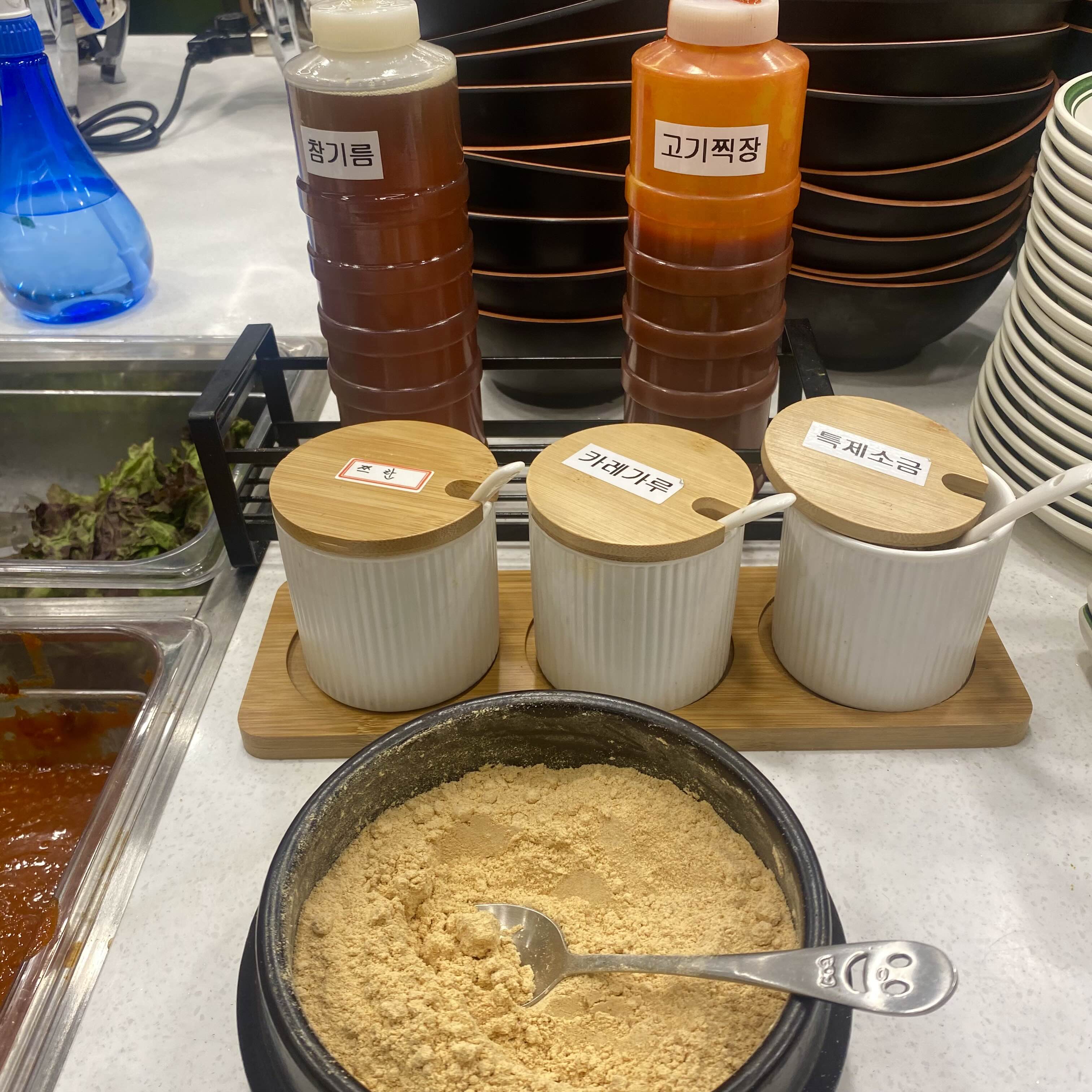 메뉴바 뒷편에는 각종 양념과 야채류가 있습니다.