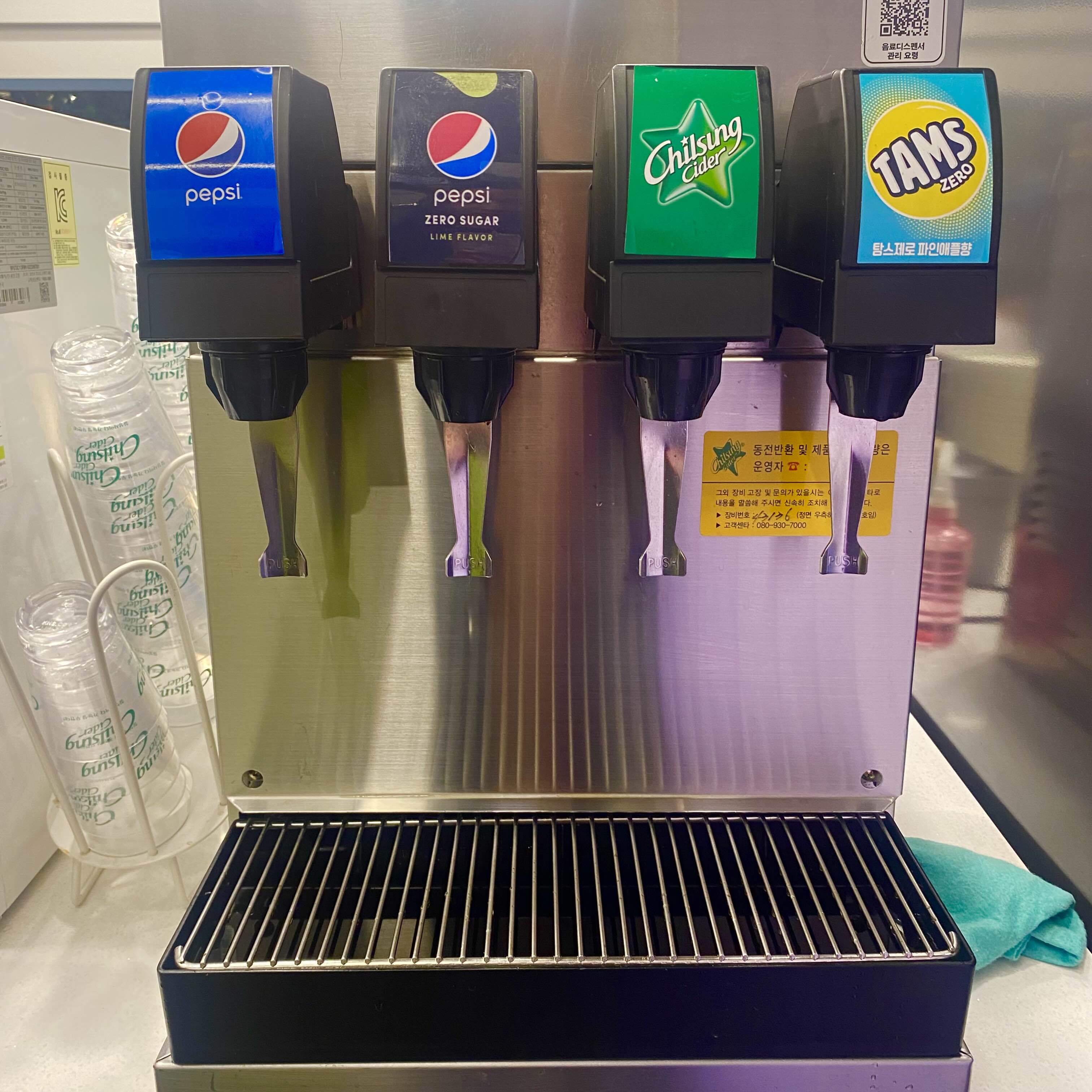 음료디스펜서가 있습니다. 이건 좀 불편했는데요. 컵이 너무 작고, 음료도 먼가 밍밍한 맛이났었습니다.