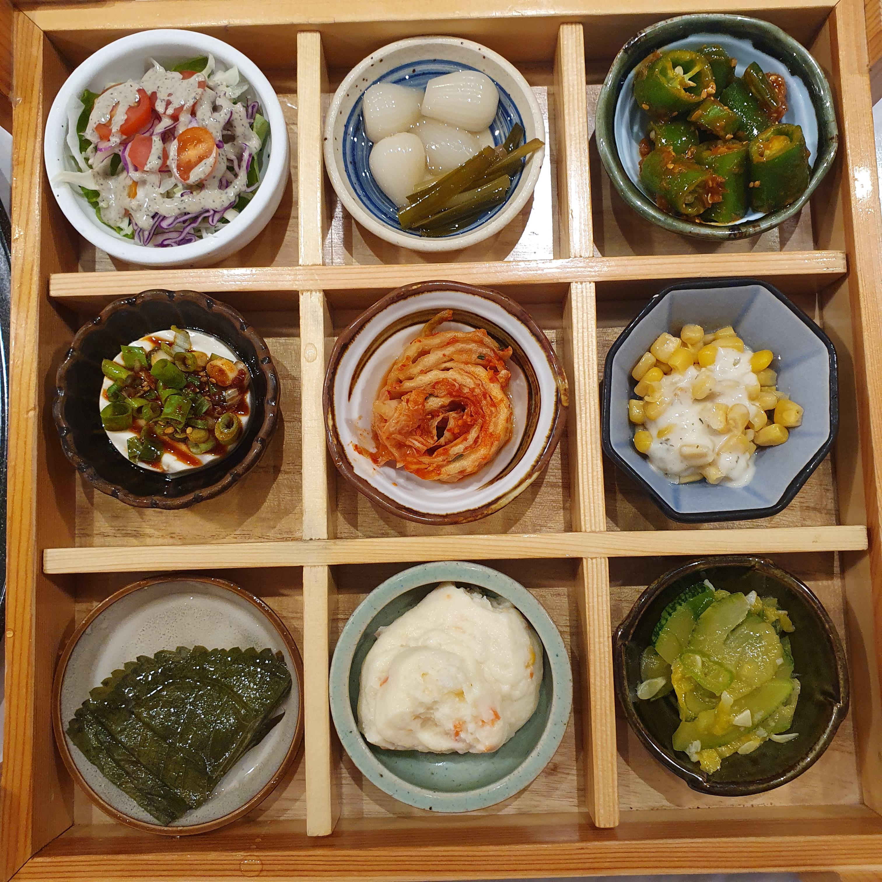 간단한 양념과 개인 양파채 그리고 상추까지 나오고, 아래처럼 작은 접시에 9가지 반찬이 예쁘게 놓였습니다.
