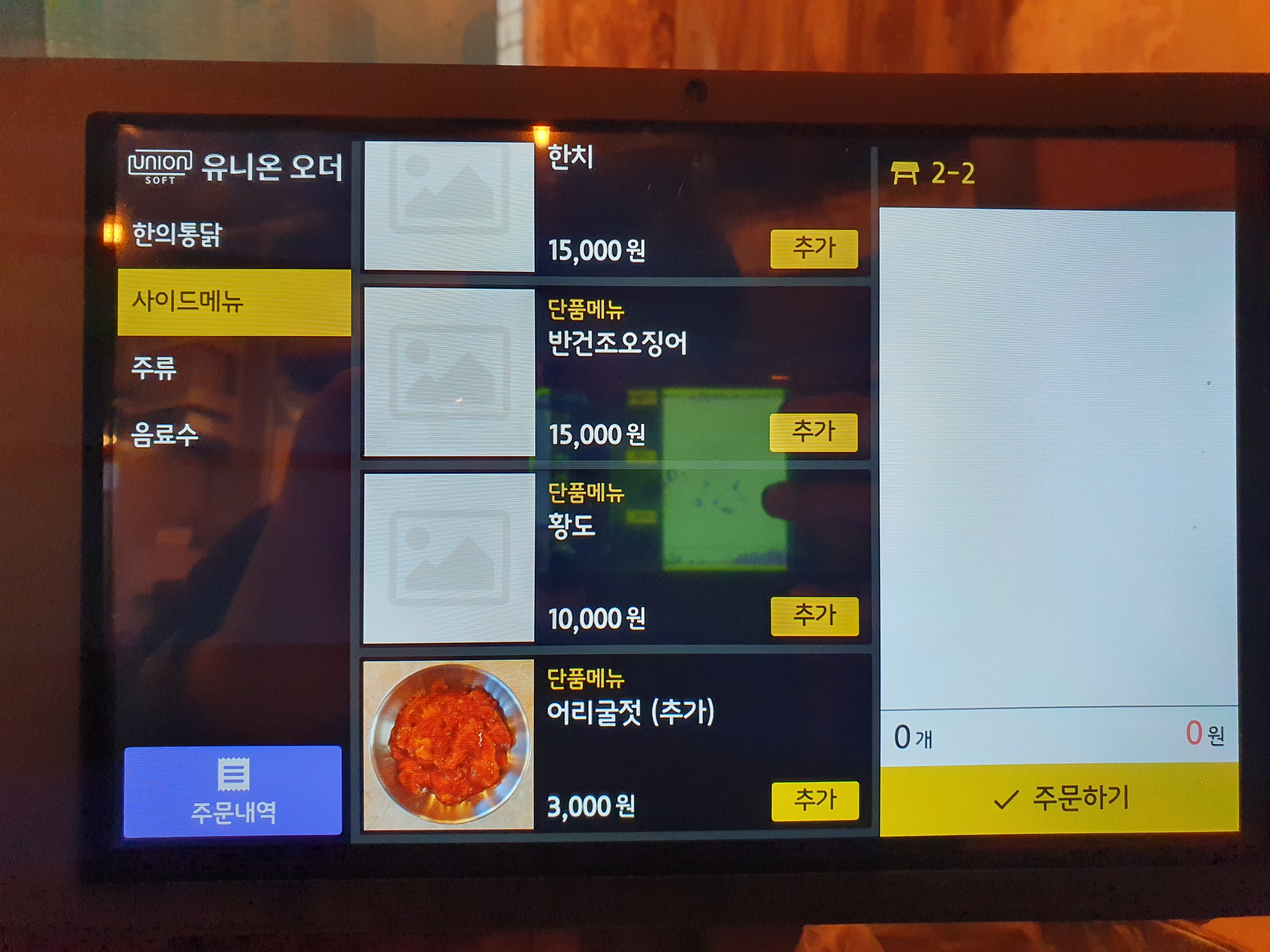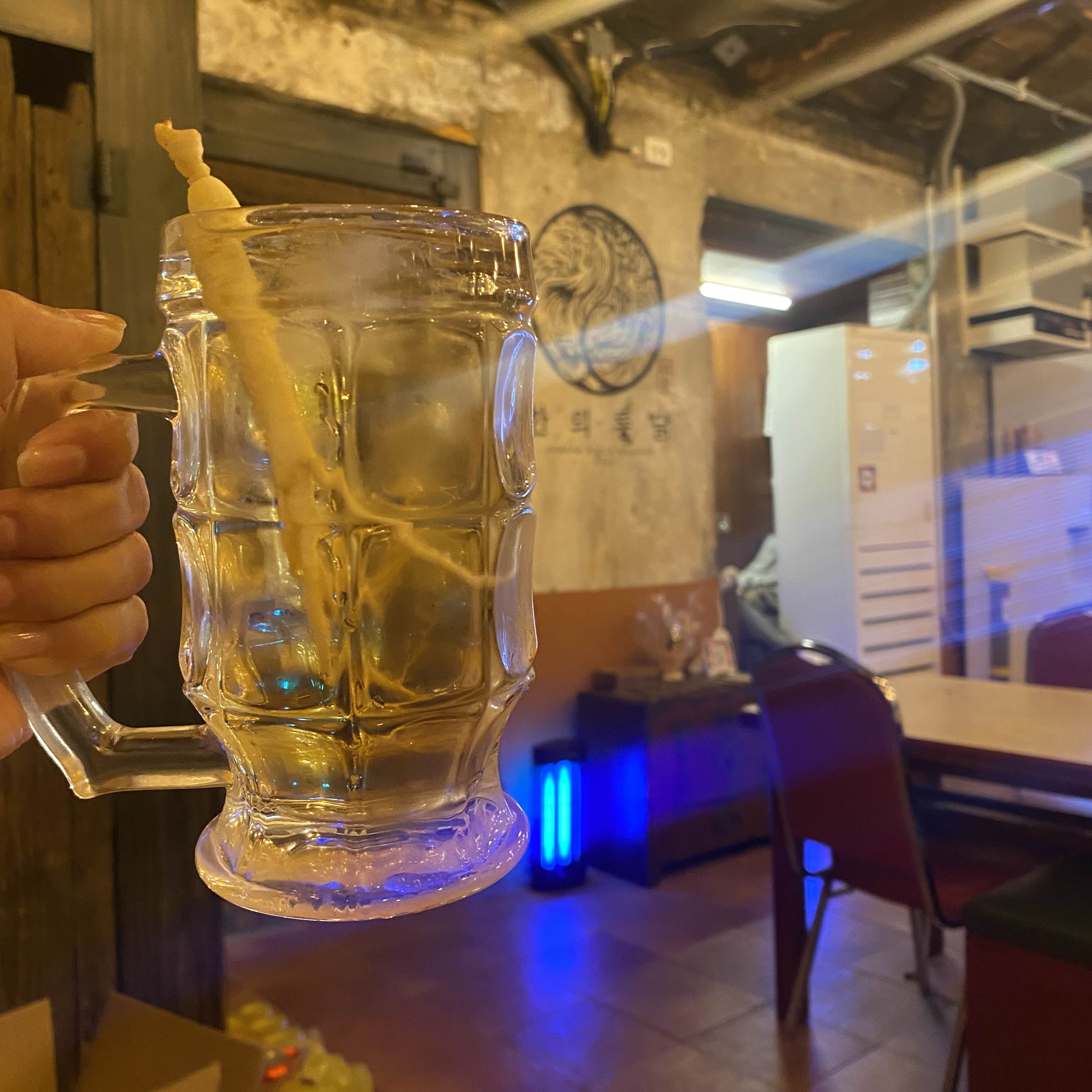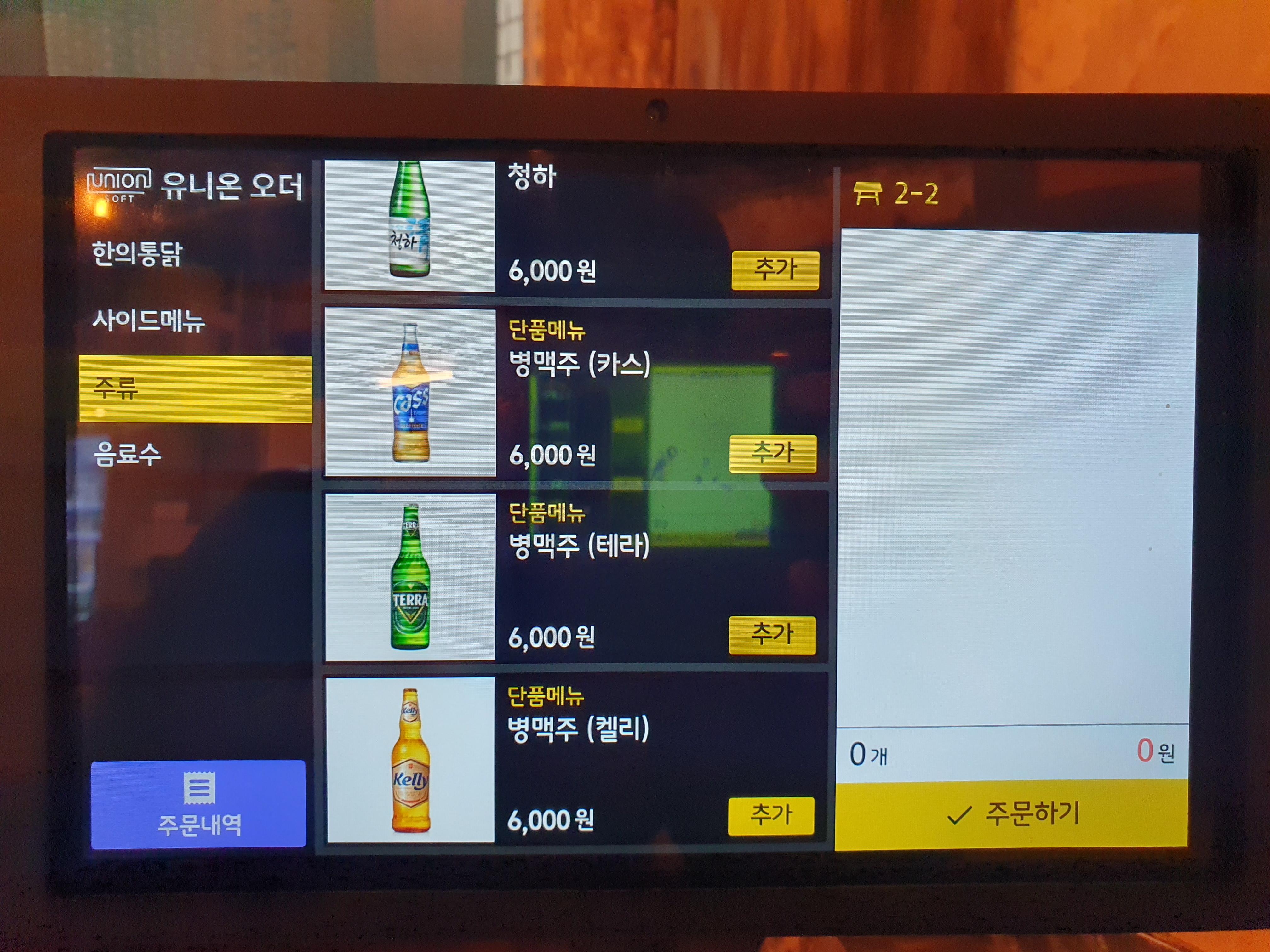 옛날 치킨집 느낌의 테이블과 의자와 한옥 천장의 조합이 먼가 신기방기하네요 ㅎㅎ