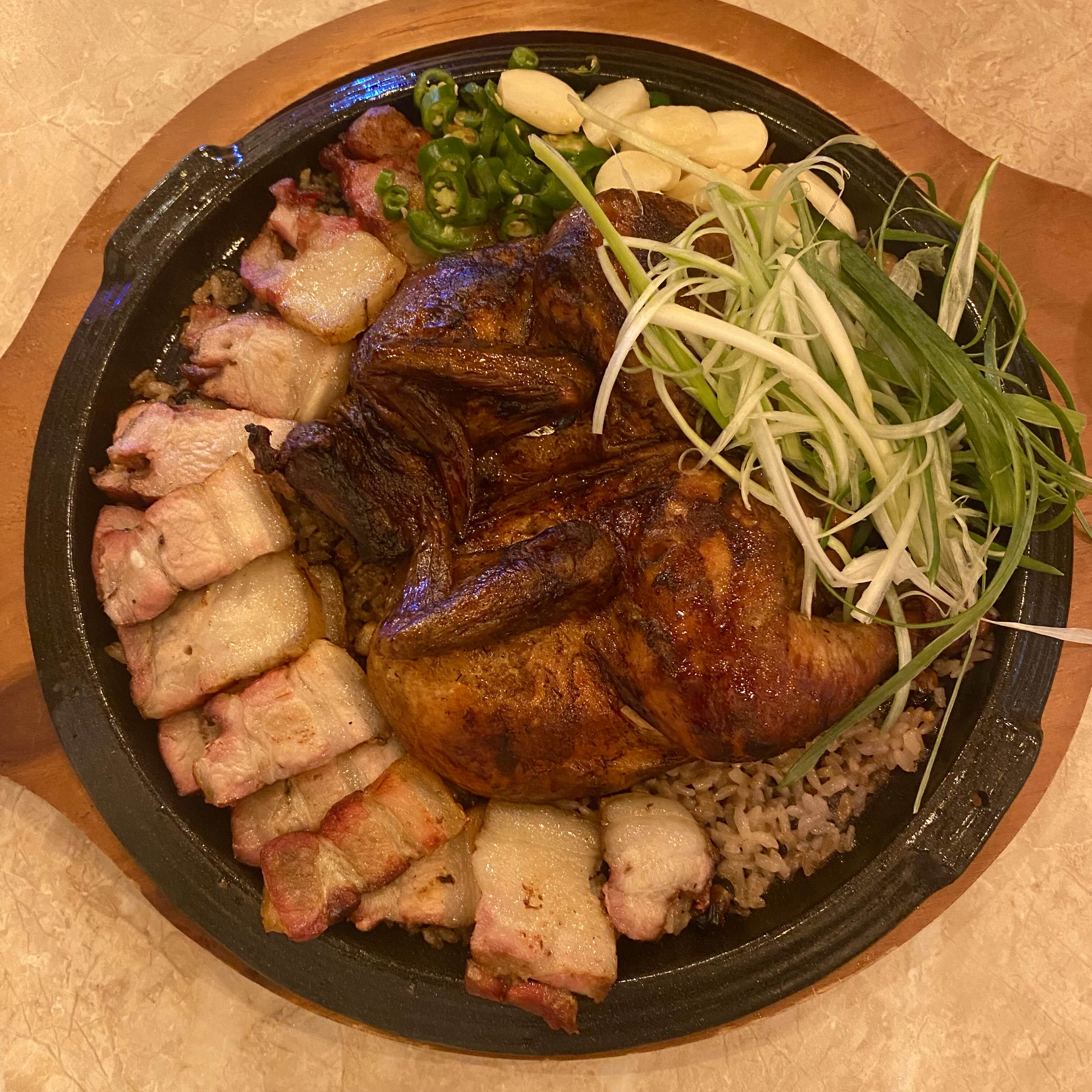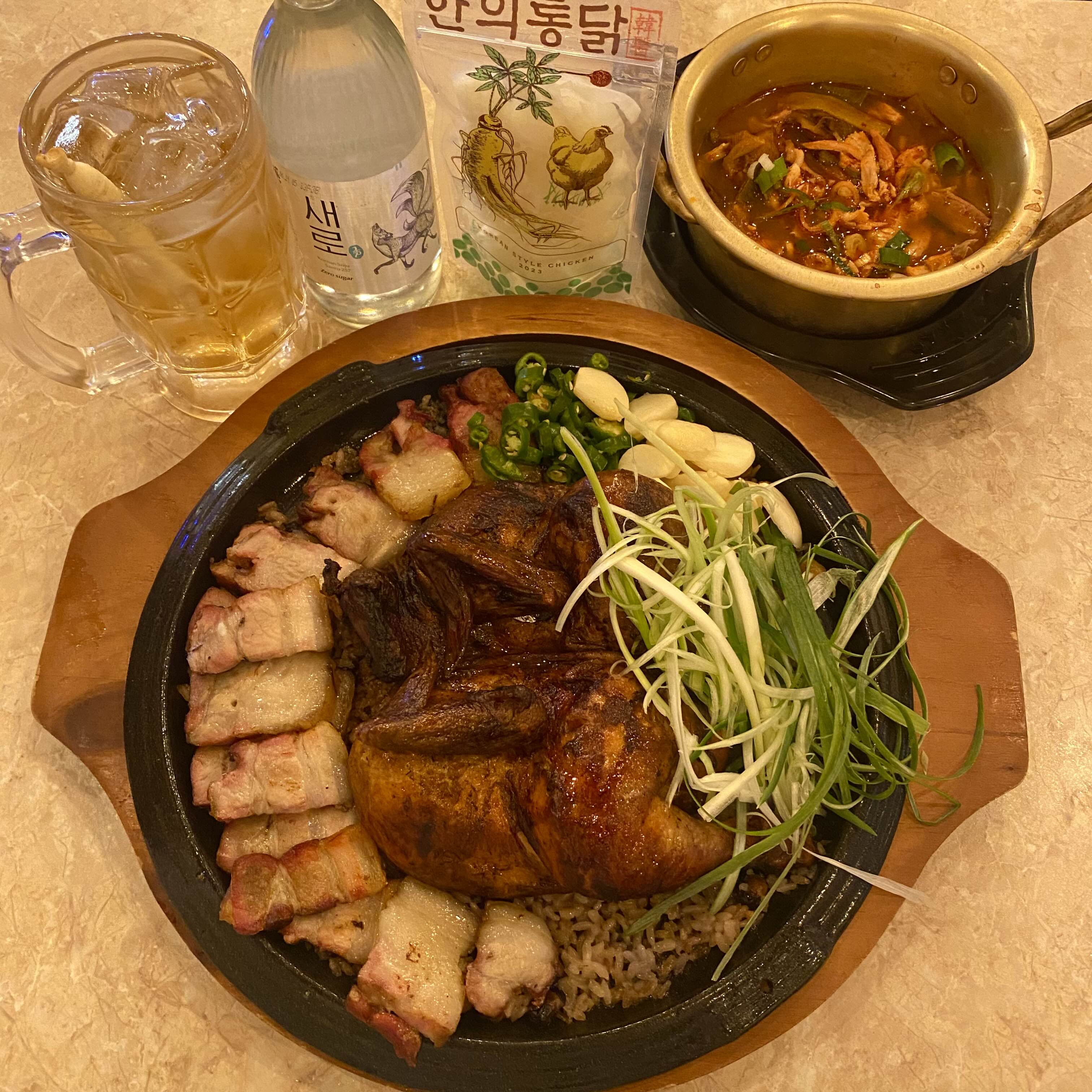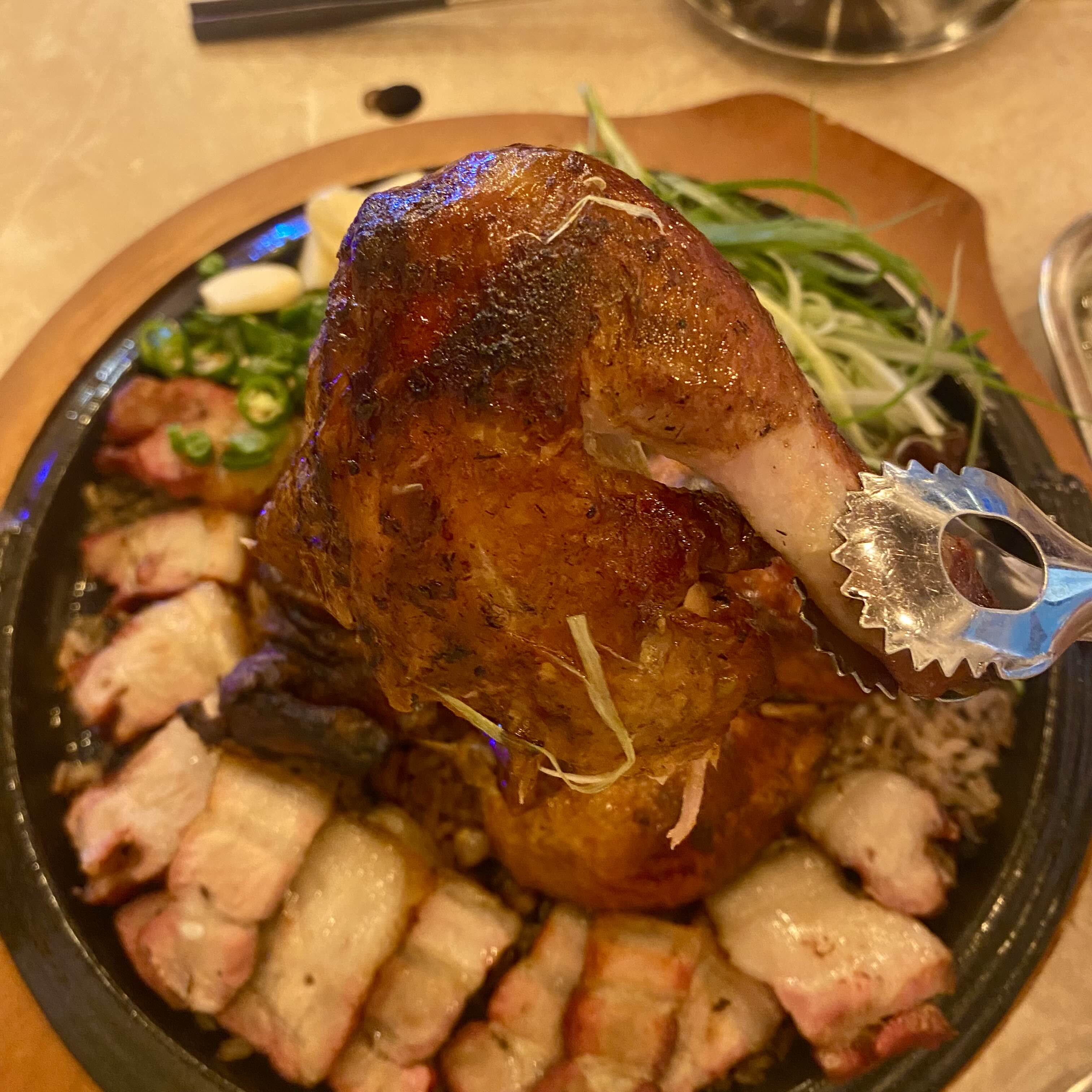 바닥에 깔려있는 누룽지와 그 위에 통닭, 통삼겹