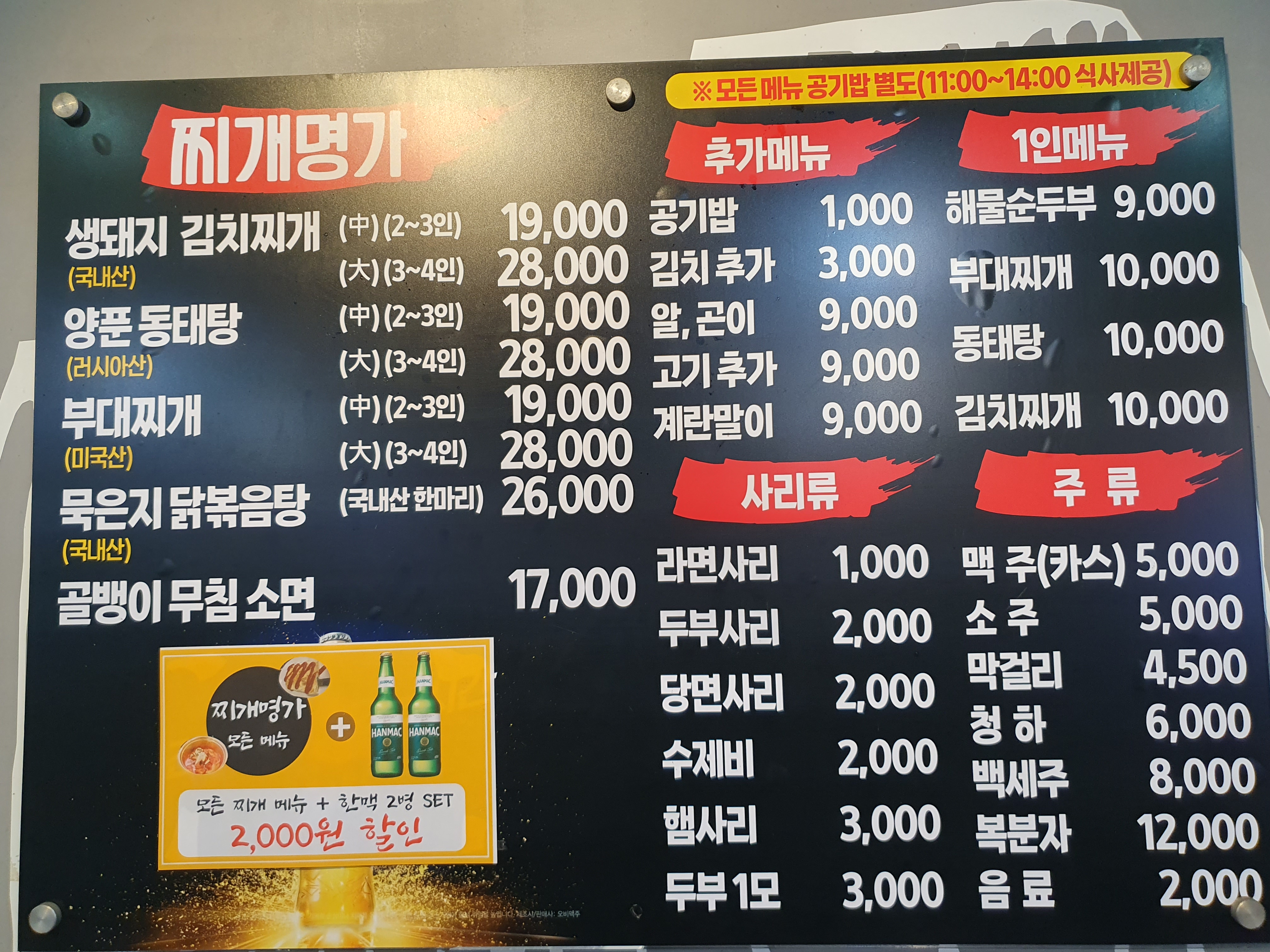 각종 찌개와 닭볶음탕이 주력 메뉴군요!