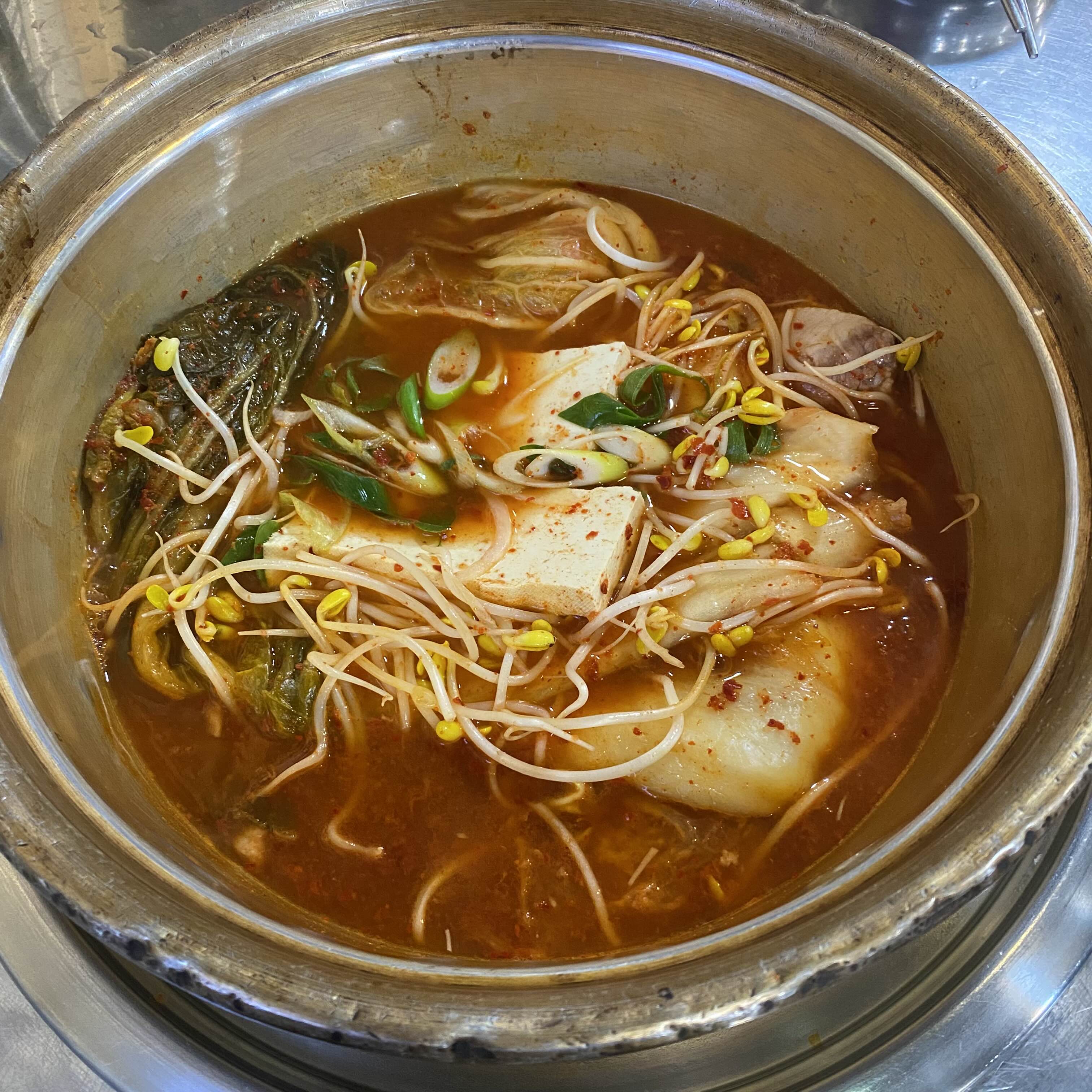 커다란 김치와 돼지고기, 두부와 콩나물이 들어있습니다 해장하며 다시 술먹기 좋아보이네요.