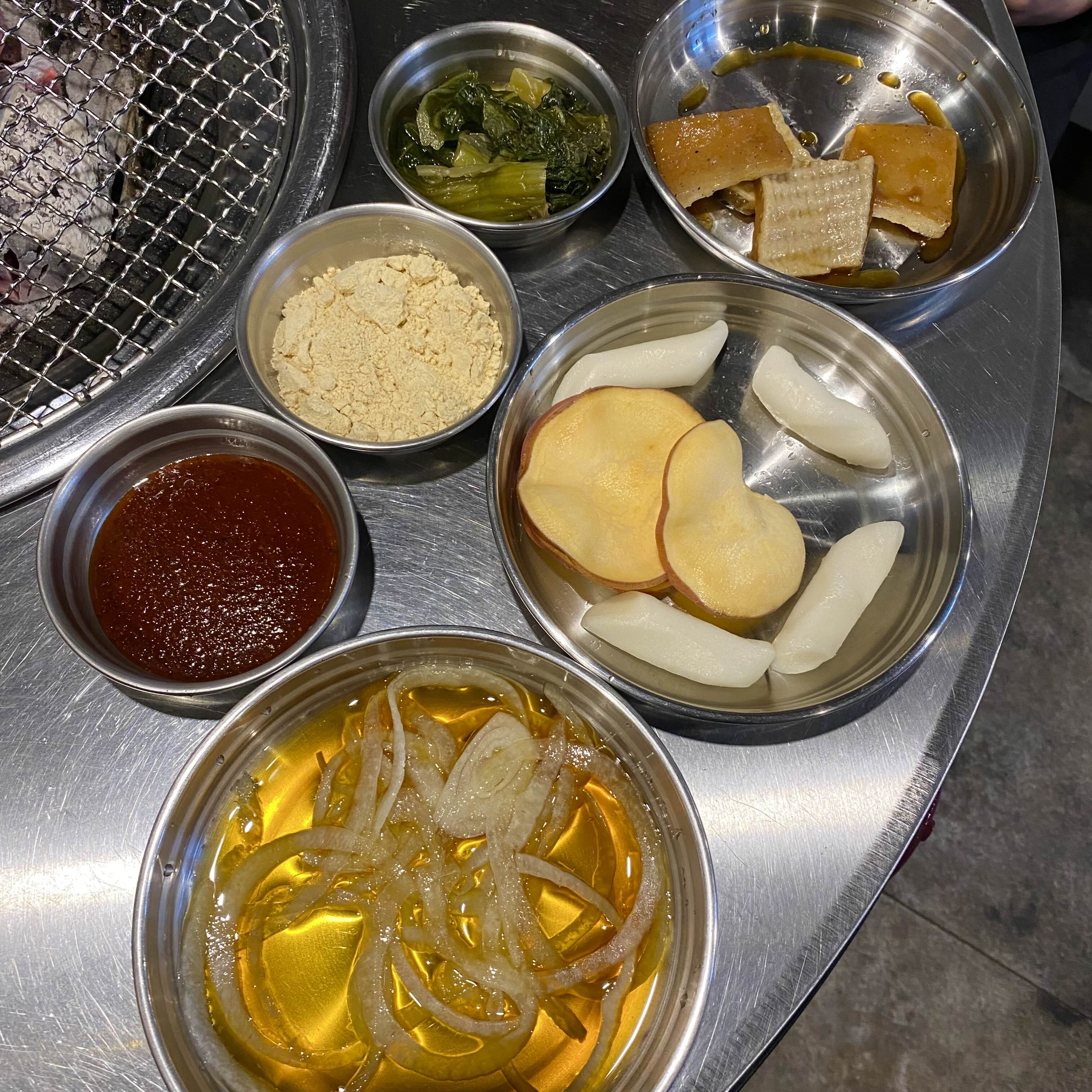 기본반찬이랄까요..? 특제양념과 양파절임, 그리고 쪽갈비를 초벌하는 동안 기다리며 구워먹을 고구마와 떡, 껍데기입니다.