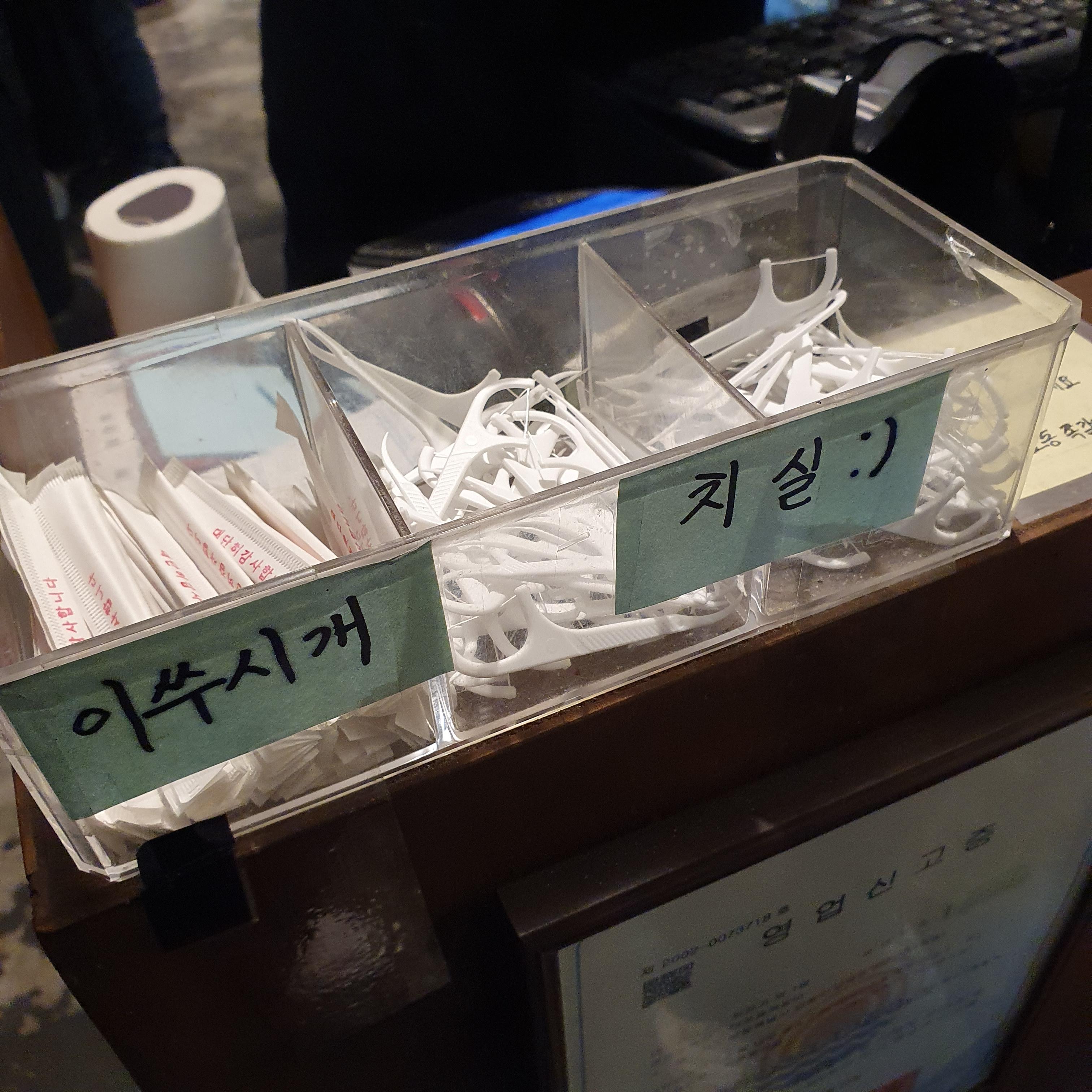 쪽갈비를 다먹고 계산하는 카운터에 이렇게 치실까지 준비되어있습니다.