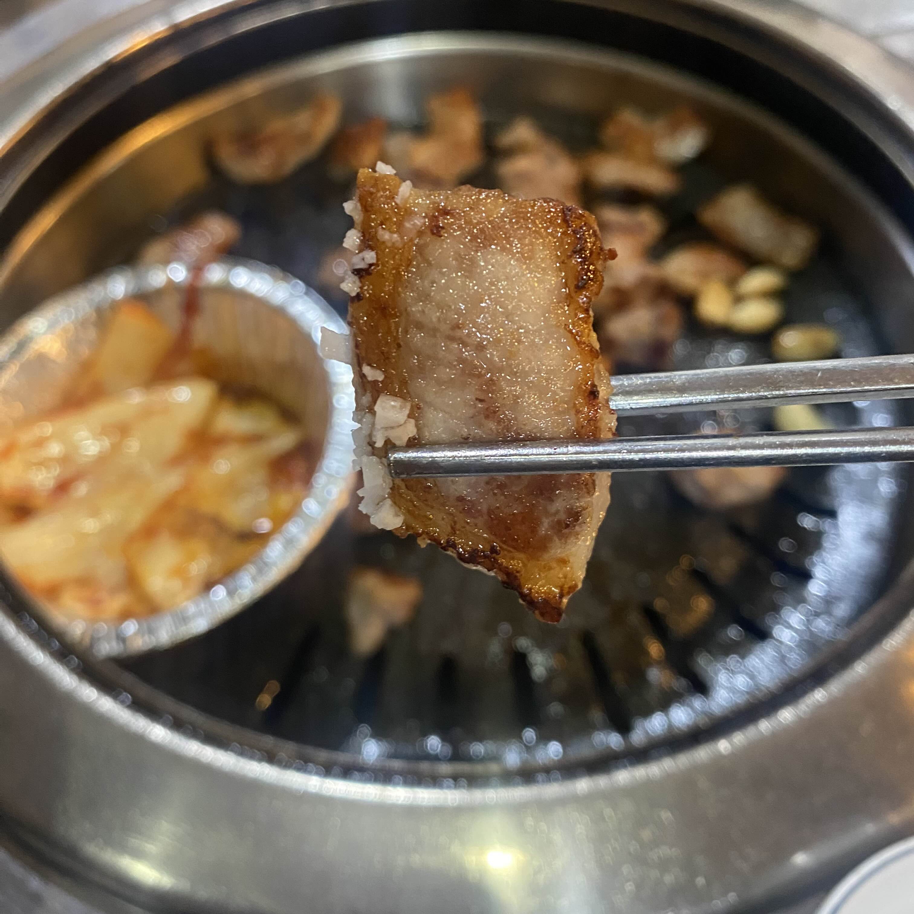 고기와 같이 나온 비계로 불판 한번 닦아주고 고기 올려줬어요