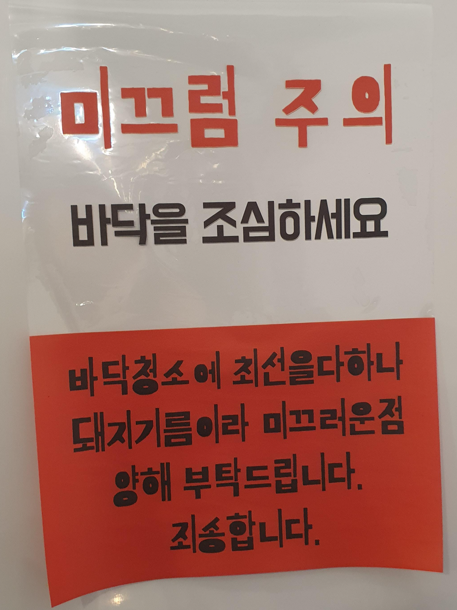 저는 별로 느끼지 못했는데, 바닥이 조금 미끄러운가봐요. 이런 안내문이 붙어있더라구요.