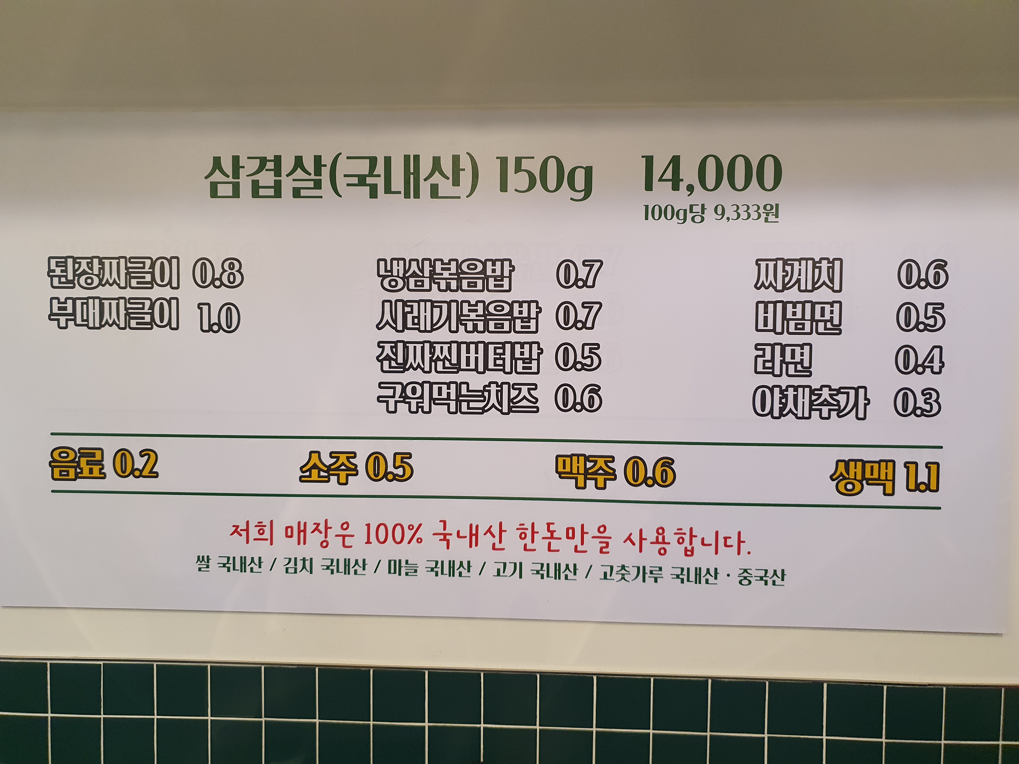 저희는 두명이서 방문하여 냉동 삼겹살 2인분과 부대 짜글이를 주문하였습니다.