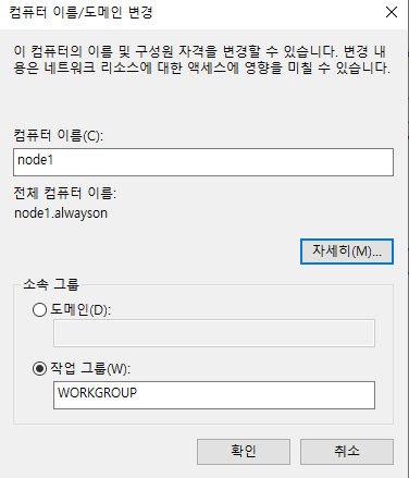 컴퓨터이름은 각각 사용하기 편한명칭으로 바꾼다. node1 / node2로 각각의 서버 명칭을 정하였다.