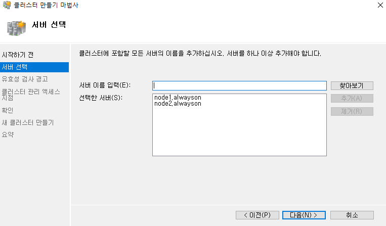 클러스터에 포함될 노드들의 명칭을 입력하여 추가한다.