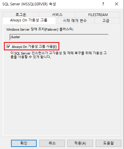 [SQL Server 구성 관리자 -> SQL Server 서비스 -> SQL Server 속성 -> Always On 가용성 그룹]