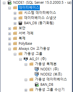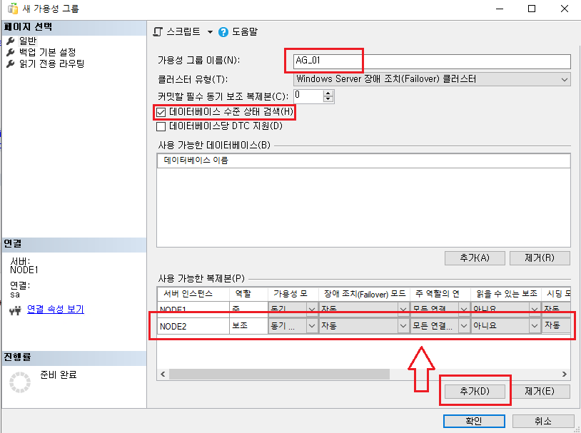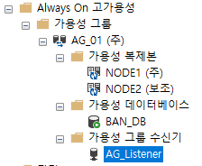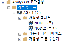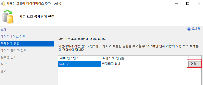 위와 같이 가용성 그룹이 생성되었으며, 추가로 Node2를 가용성 그룹에 연결한다.