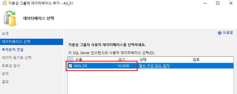 가용성 데이터베이스에 추가할 데이터베이스를 체크한다.