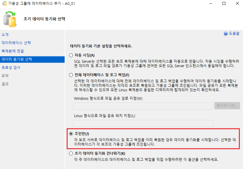 동기화 기본 설정은 조인만을 선택하여 진행한다.