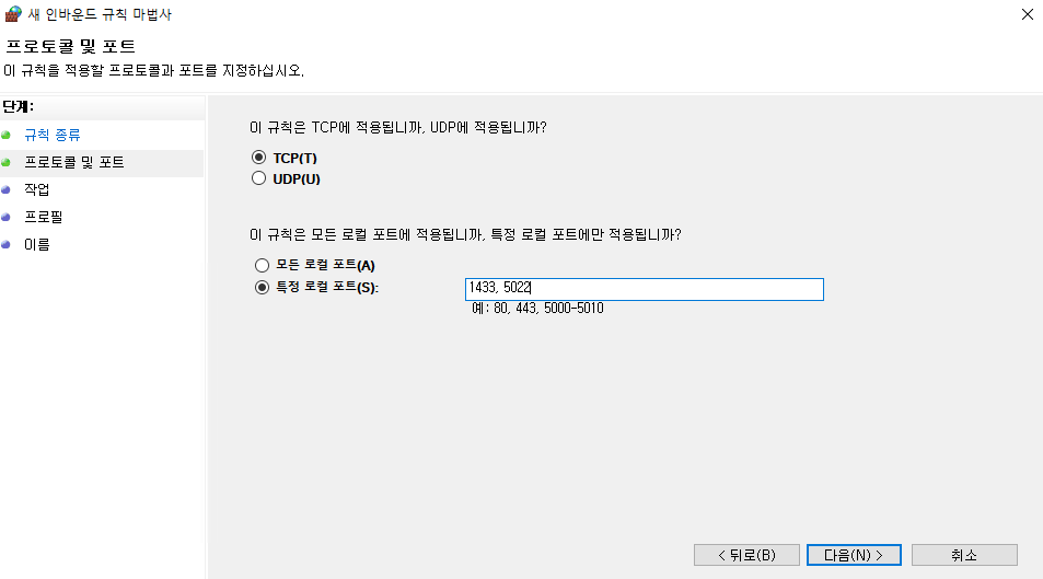 인바운드 규직으로 1433, 5022 포트를 접근을 허용한다.
