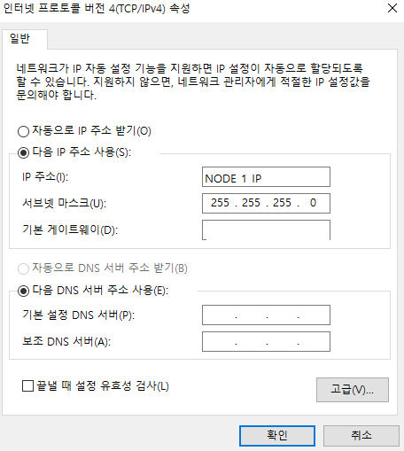 두대의 서버에 각각의 IP와 게이트웨이 주소를 넣어준다. AD서버 없이 진행 하므로 DNS 서버 주소는 빈값으로 넘어간다.