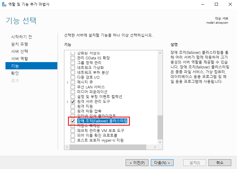 앞에부분은 기본 값들로 넘어간 후 기능 페이지에서 장애조치 클러스터링을 체크하여 설치한다.