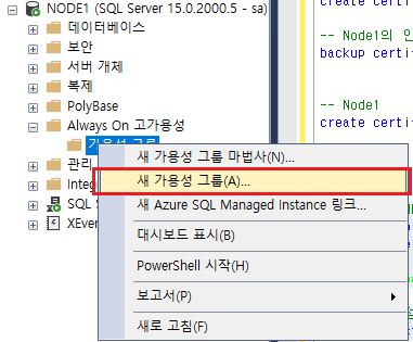 [SQL Server Node1 -> Always On 고가용성 -> 가용성 그룹 -> 새 가용성 그룹]