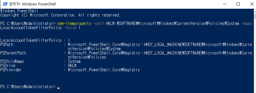 new-itemproperty -path HKLM:\SOFTWARE\Microsoft\Windows\CurrentVersion\Policies\System -Name LocalAccountTokenFilterPolicy -Value 1
