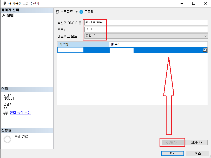 Node1에서 가용성 그룹 수신기를 추가한다.