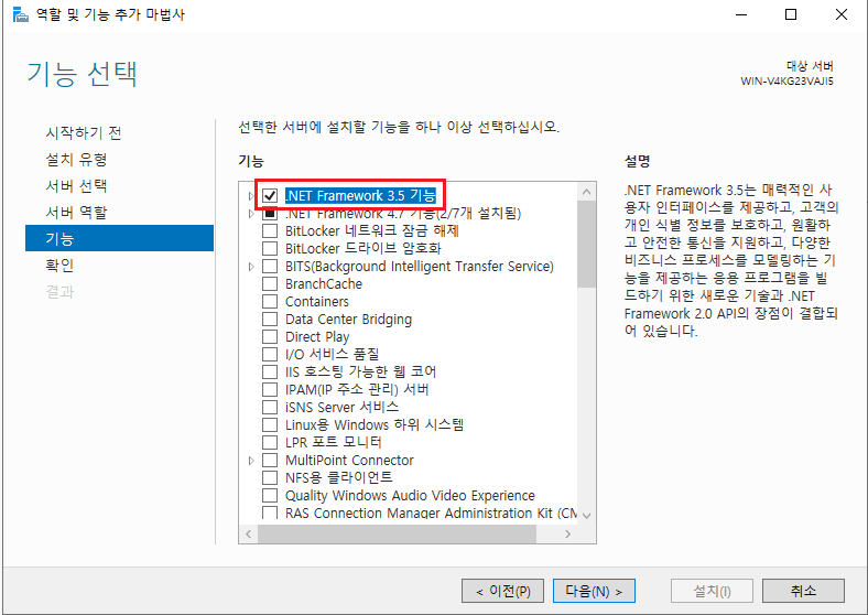 기능 탭까지 쭉 진행하여 기능 탭에서 [.NET Framework 3.5 기능] 을 체크 표시한다.