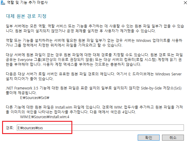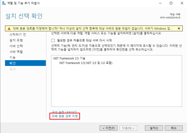 기능 설치 도중 [설치 선택 확인 페이지 -> 대체 원본 경로 지정]으로 들어간다.
