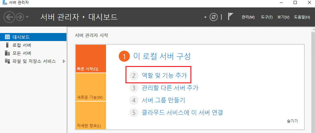 [서버관리자의 역할 및 기능 추가] 를 선택한다.