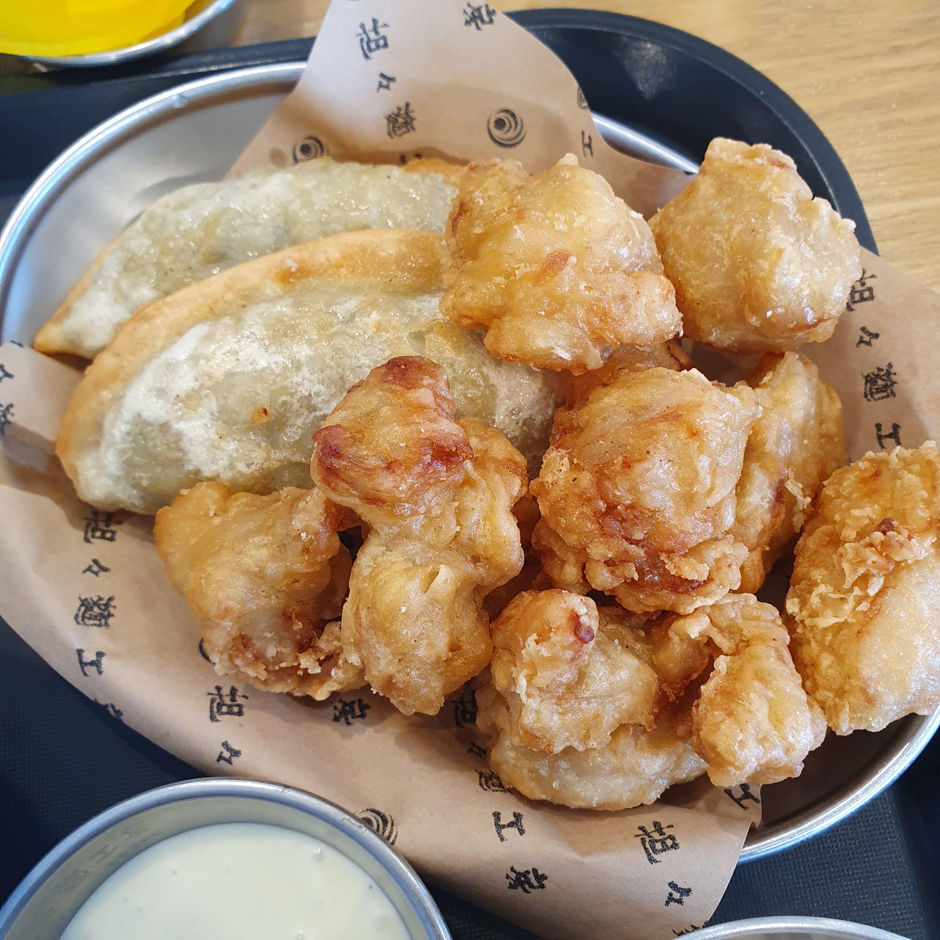 마지막으로는 세트메뉴로 같이나온 육고명튀김교자 2개와 바삭순살닭튀김 입니다.