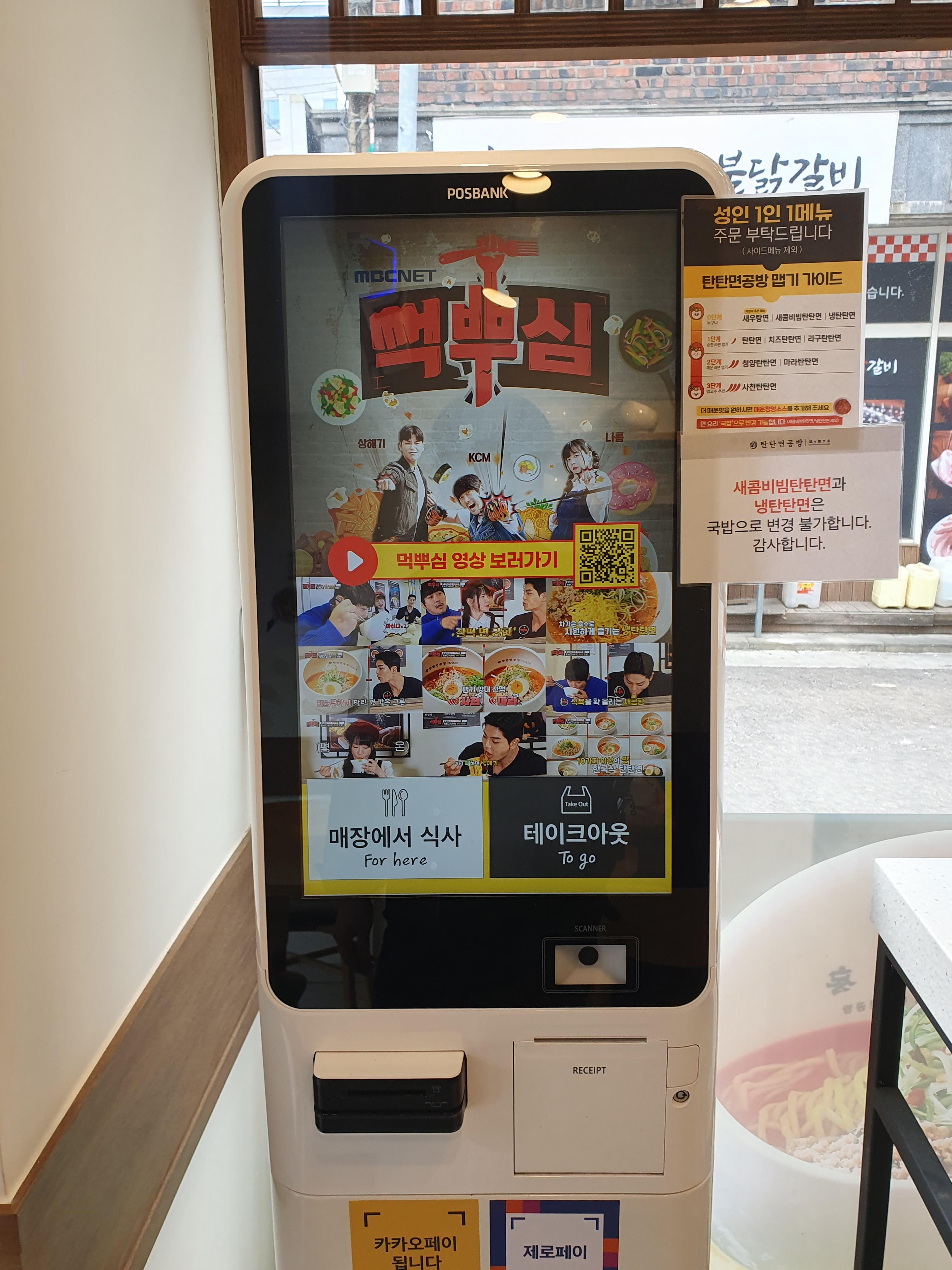 먼저 주문을 할 수 있는 키오스크입니다. 탄탄면공방은 셀프매장으로 여러구역이있는데요.