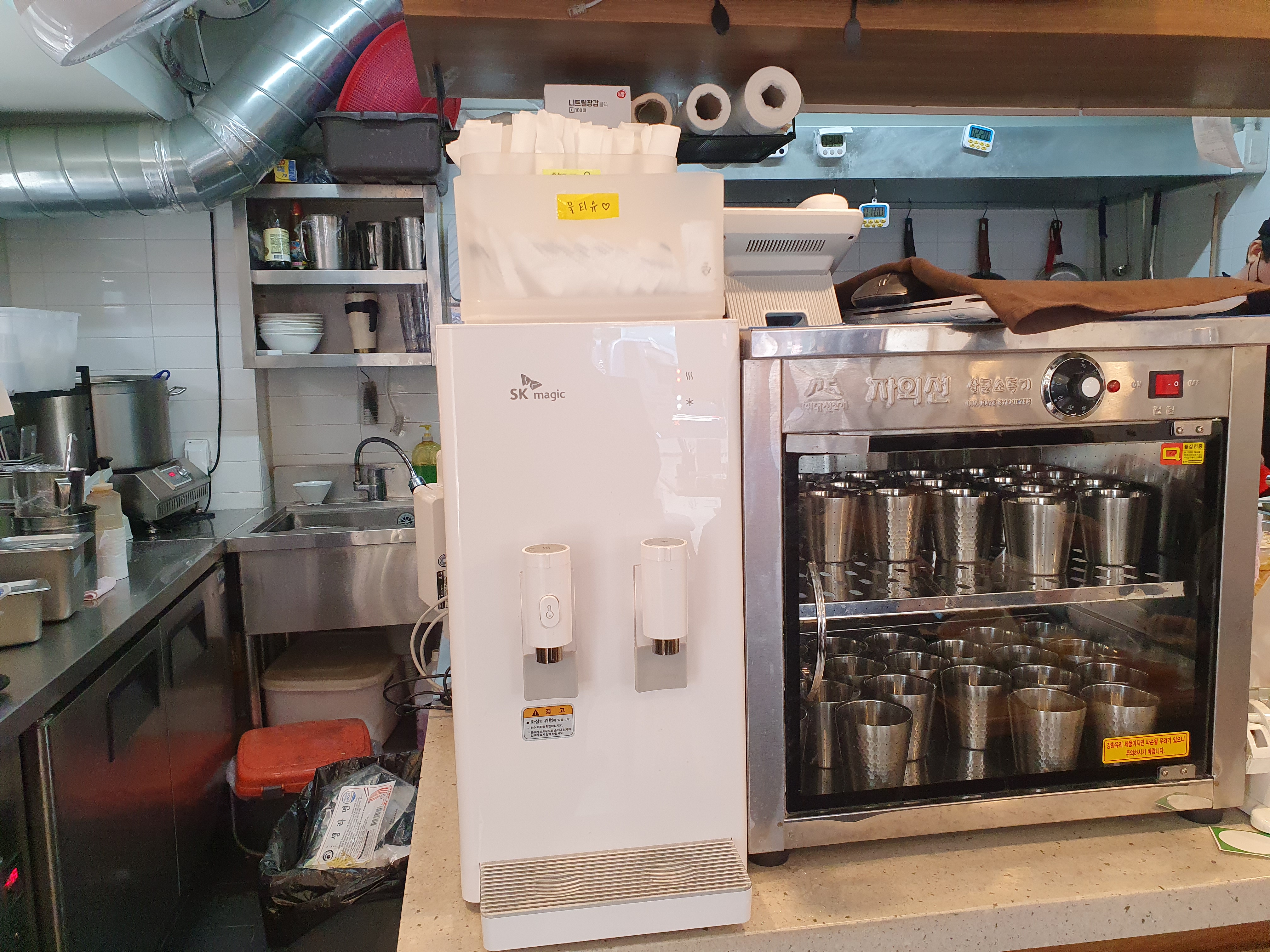식사를 마치고 식기를 반납하는 퇴식구도 있고, 정수기와 물컵, 물티슈 등도 따로 있습니다.