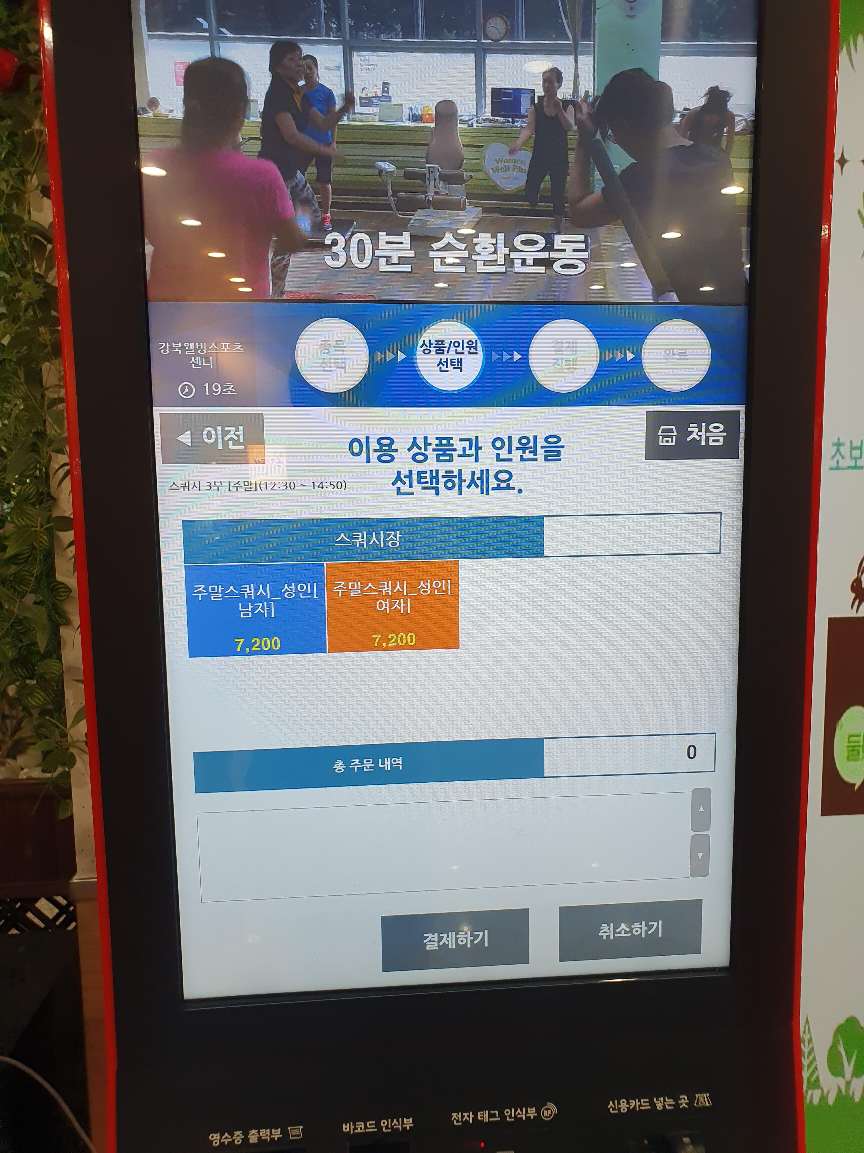 - 2층의 무인 발권기를 이용하여 타임별 스쿼시입장권을 발권