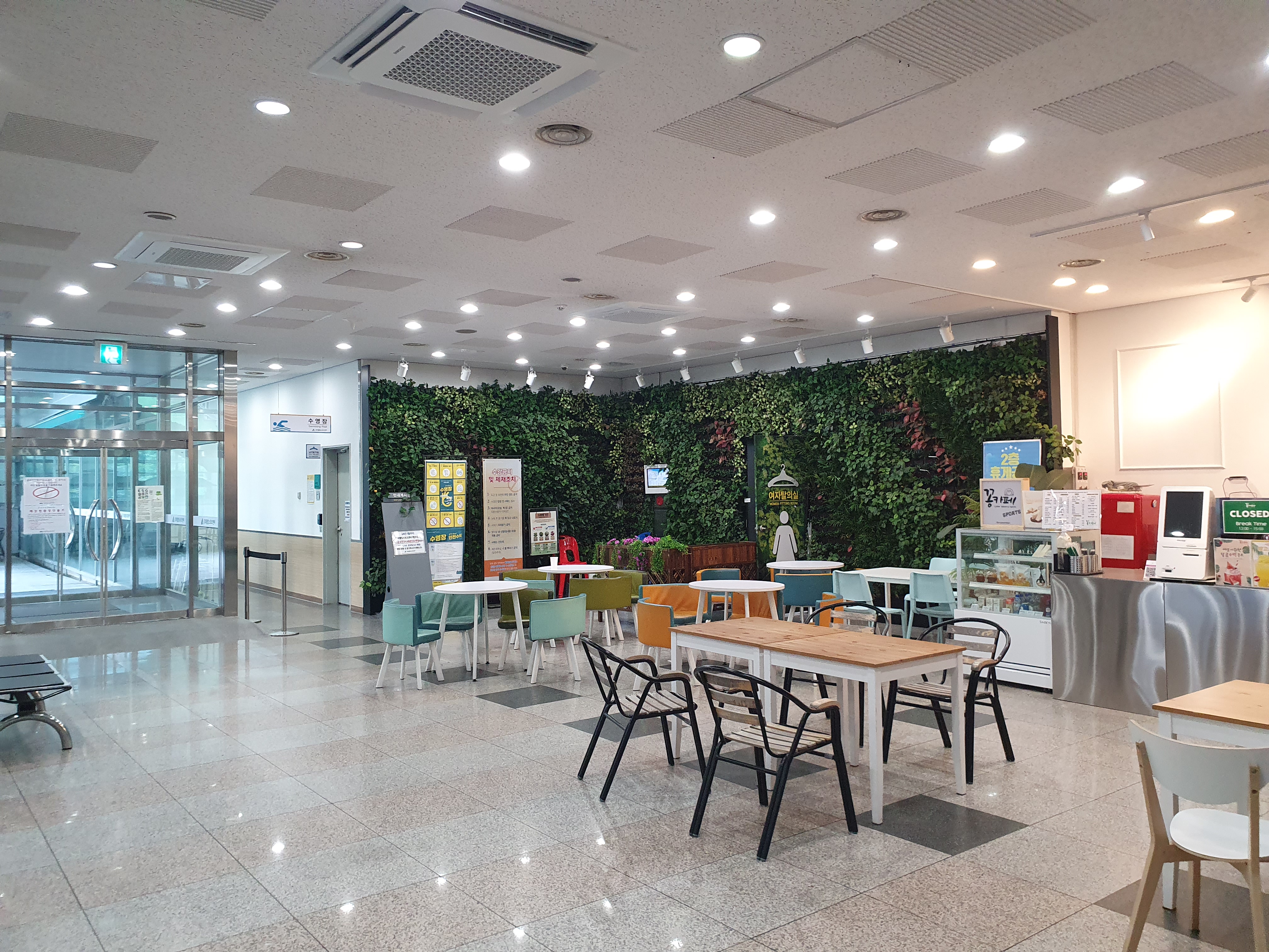 스쿼시장 입구가 있는 1.5층을 지나 계단을 더 올라가면, 카페와 함께있는 2층에서 발권과 각종 시설을 이용 할 수 있습니다.