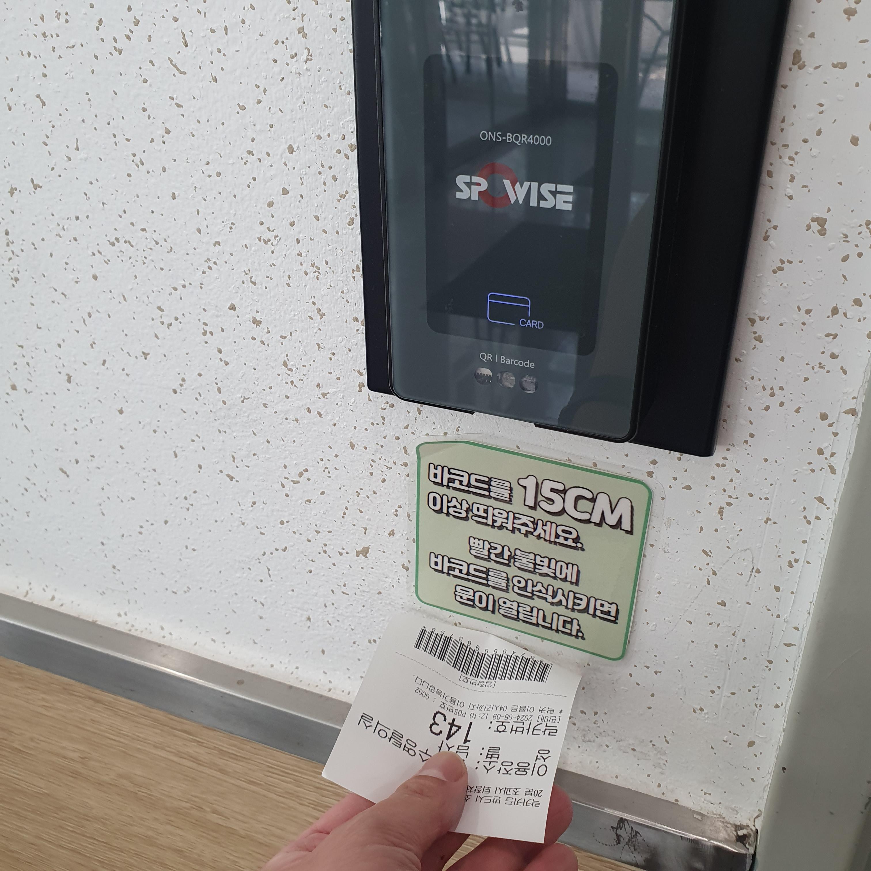 사진에서 보이는 것 처럼 표의 바코드를 읽히면 문이 열립니다. 저정도 거리에서 해야하니 주의해주세요.
