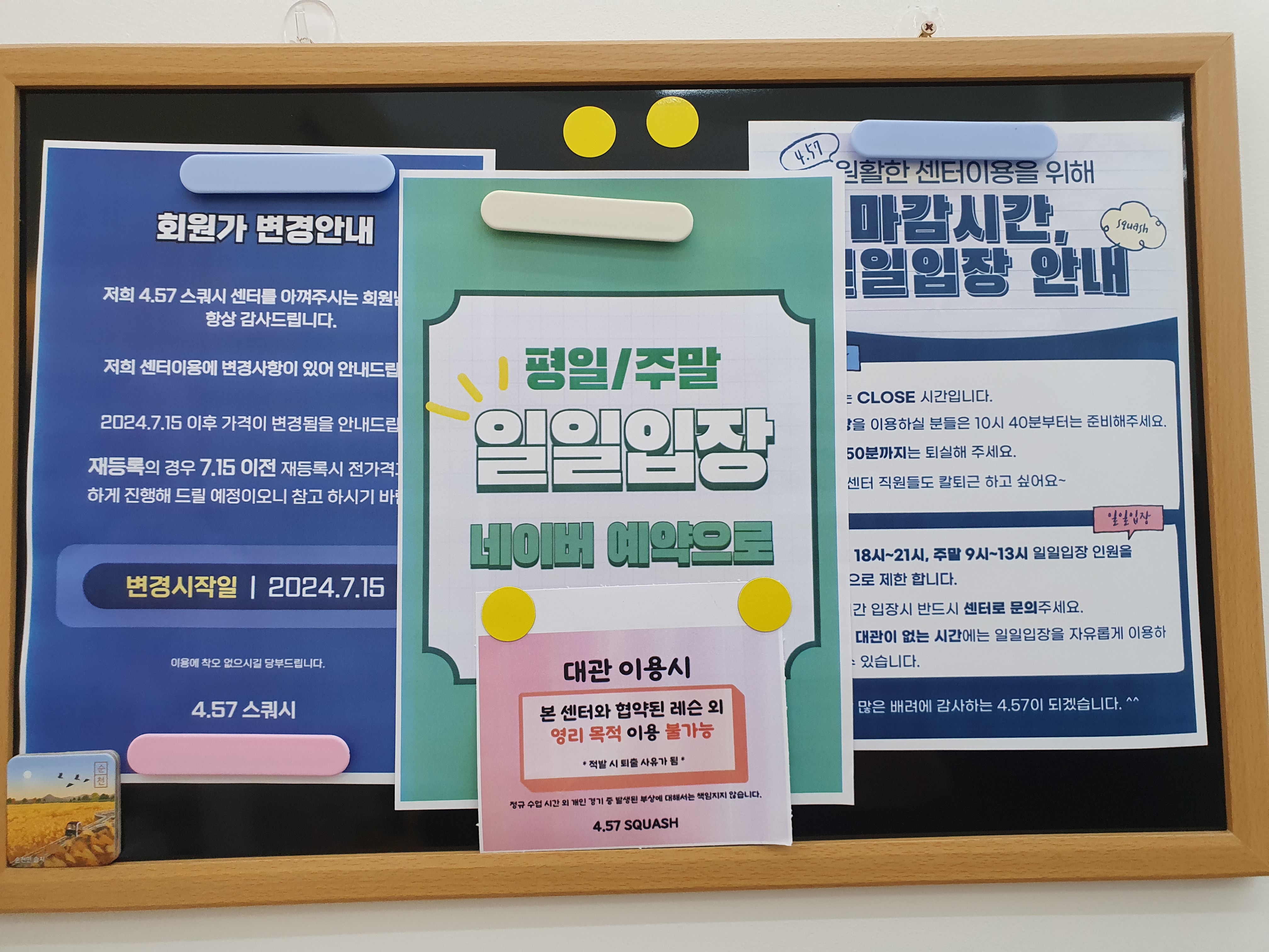 주말의 대관 일정을 알려주는 안내 게시판과 이용수칙 등이 적혀있는 문구 등도 있습니다.
