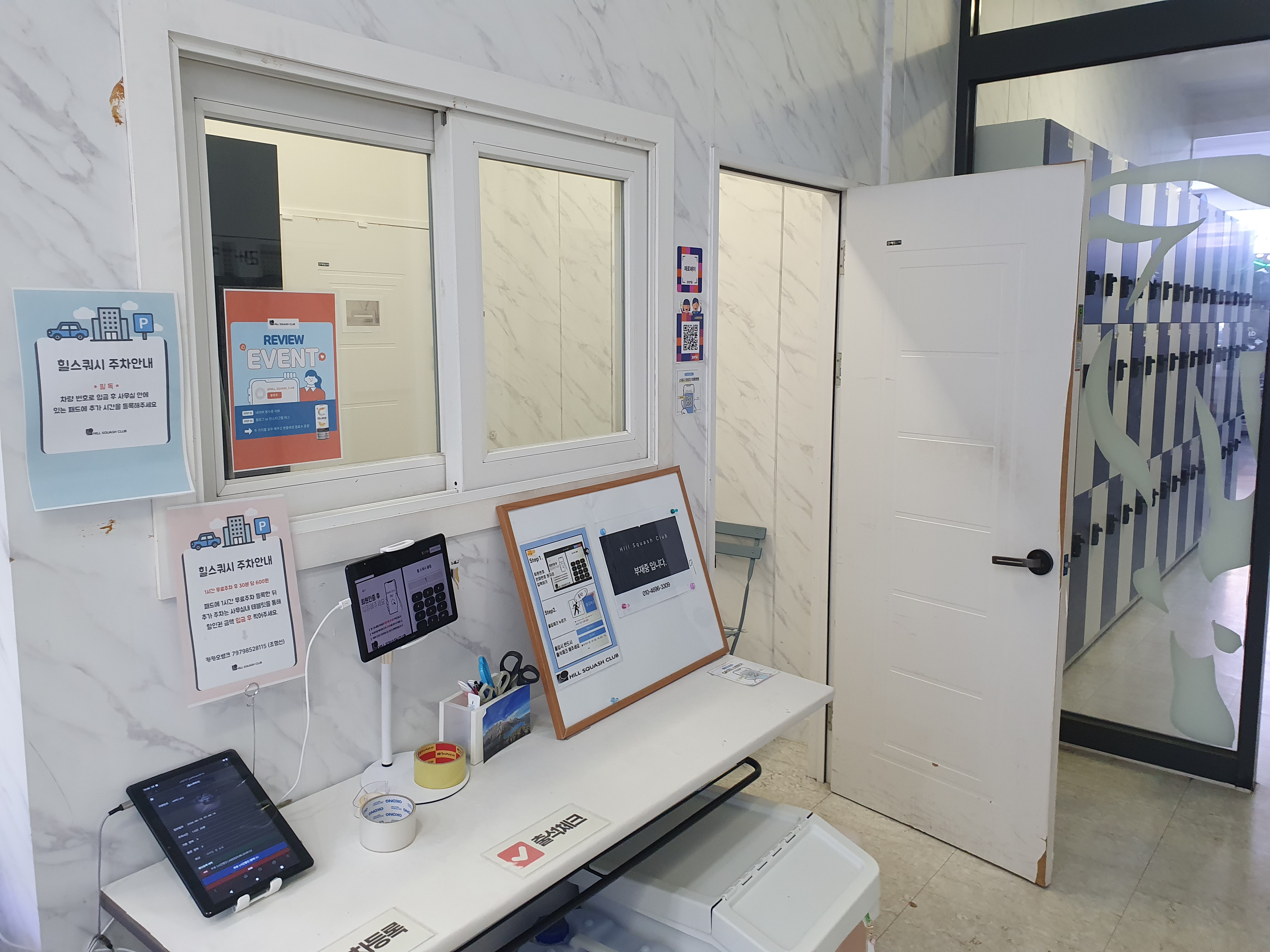 스쿼시장에 들어가면 간단한 안내데스크와 정수기 자판기 등의 편의시설이 소소하게 위치하고 있습니다.